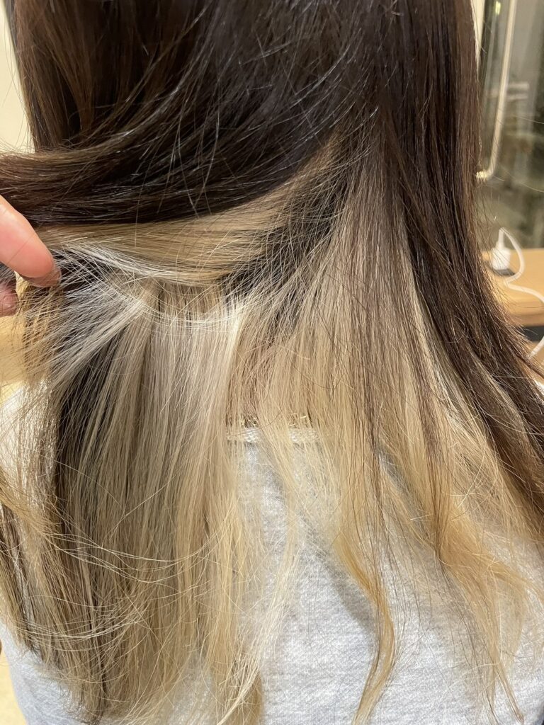 ご来店時のお客様は、以前に入れたインナーカラーが褪色し、明るいベージュ〜ブロンドのような状態になっていました。