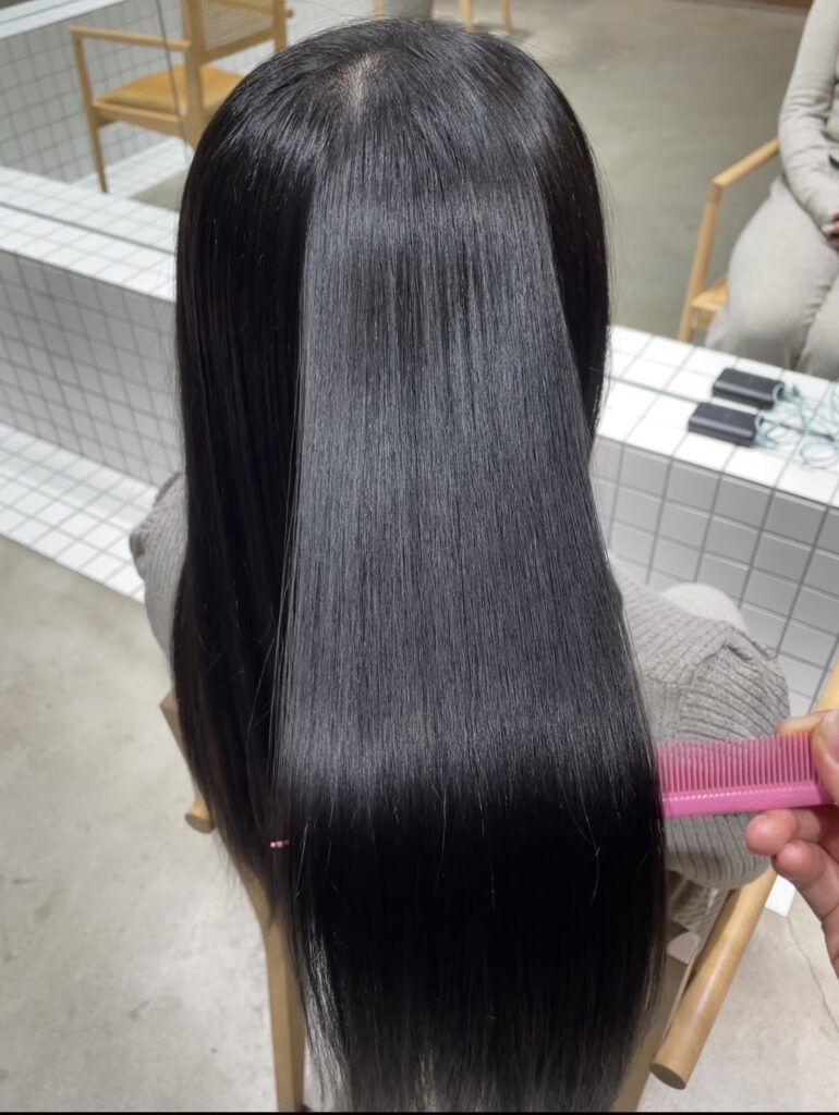 髪質改善ストレートは、単に「癖を伸ばす」だけでなく、髪を美しく魅せる質感づくりまで叶えられるメニューです。黒髪の方でも柔らかく、艶やかな仕上がりになります。