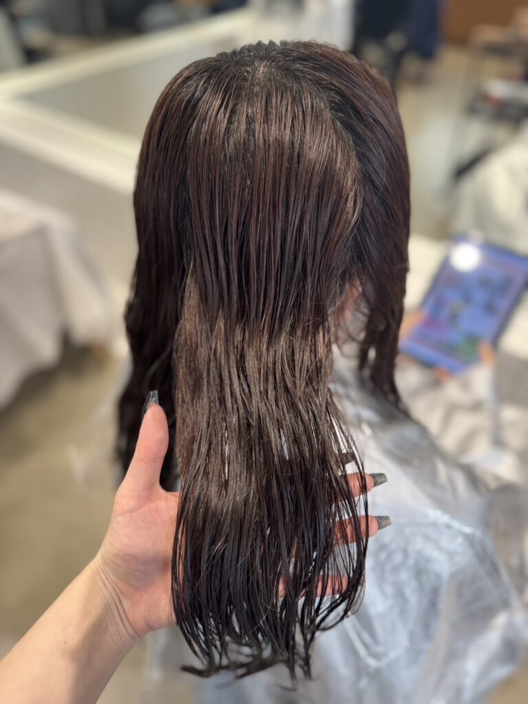ブリーチ前は何度もカラーを重ねたことで、少し硬さとパサつきが出ている状態でした。