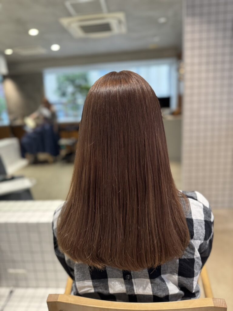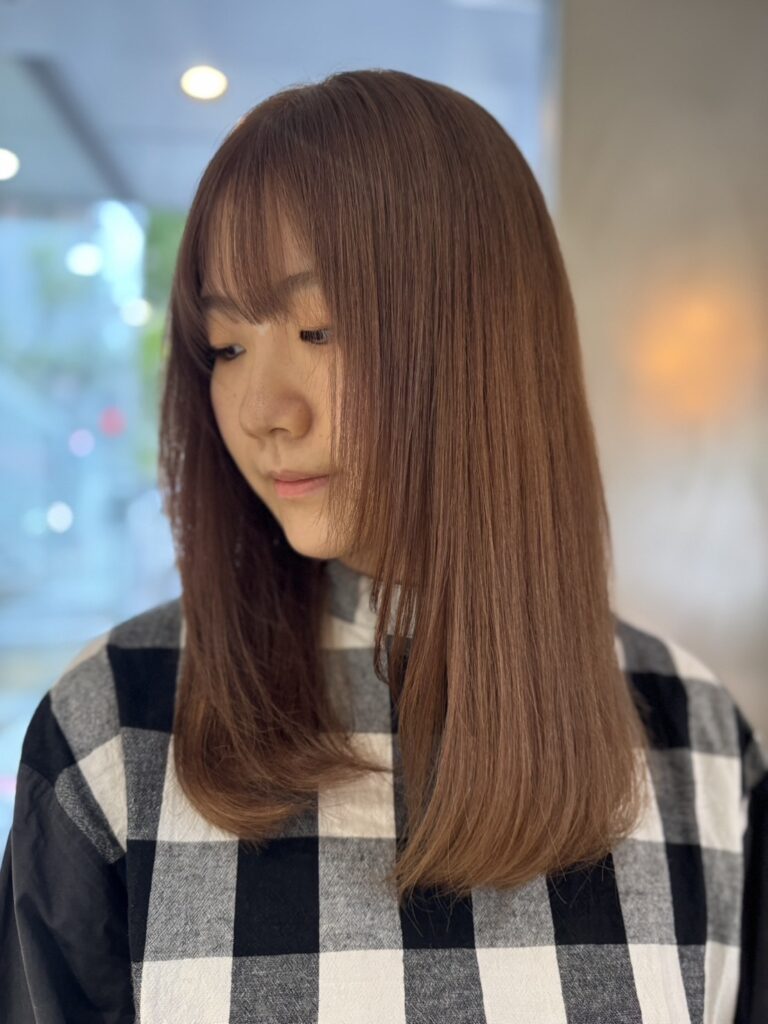 薬剤のパワーや放置時間を調整し、必要最低限のブリーチで明るさをコントロール。髪の負担を最小限にしました。