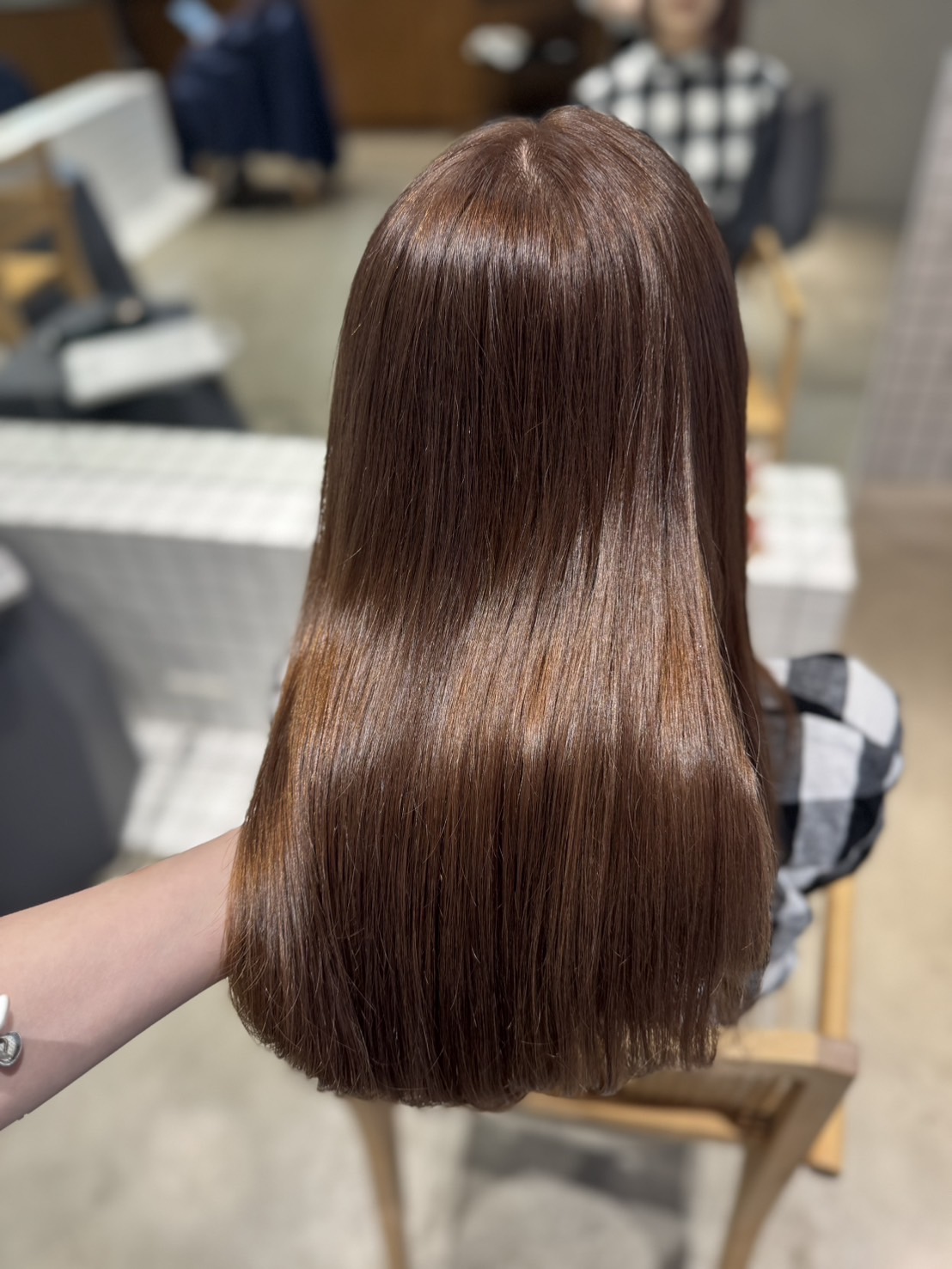 薬剤のパワーや放置時間を調整し、必要最低限のブリーチで明るさをコントロール。髪の負担を最小限にしました。