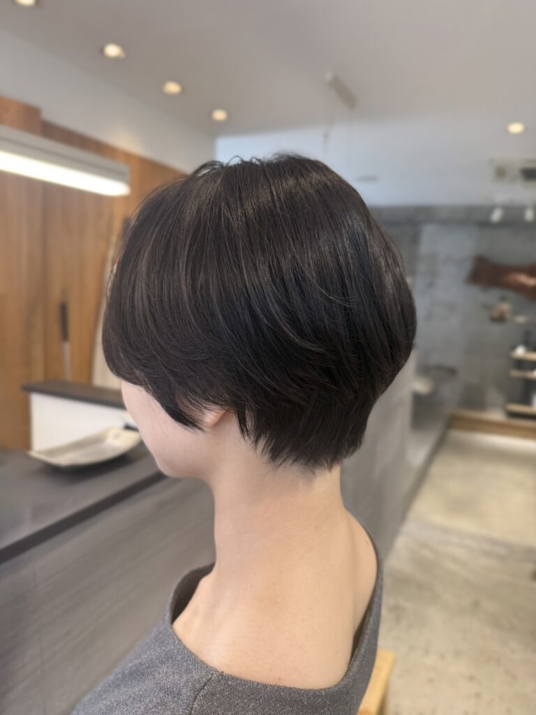 仕上がりは、後頭部に丸みを持たせたコンパクトなショート。