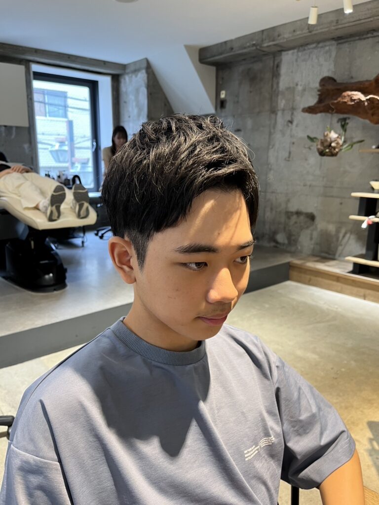 前髪は少し短めにラインを整え、自然に立ち上がるようにデザイン。