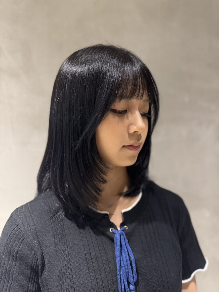 しかし、暗めのブルーカラー+適度なカット調整 を組み合わせることで、ツヤ感と扱いやすさを兼ね備えたスタイルが実現します。
