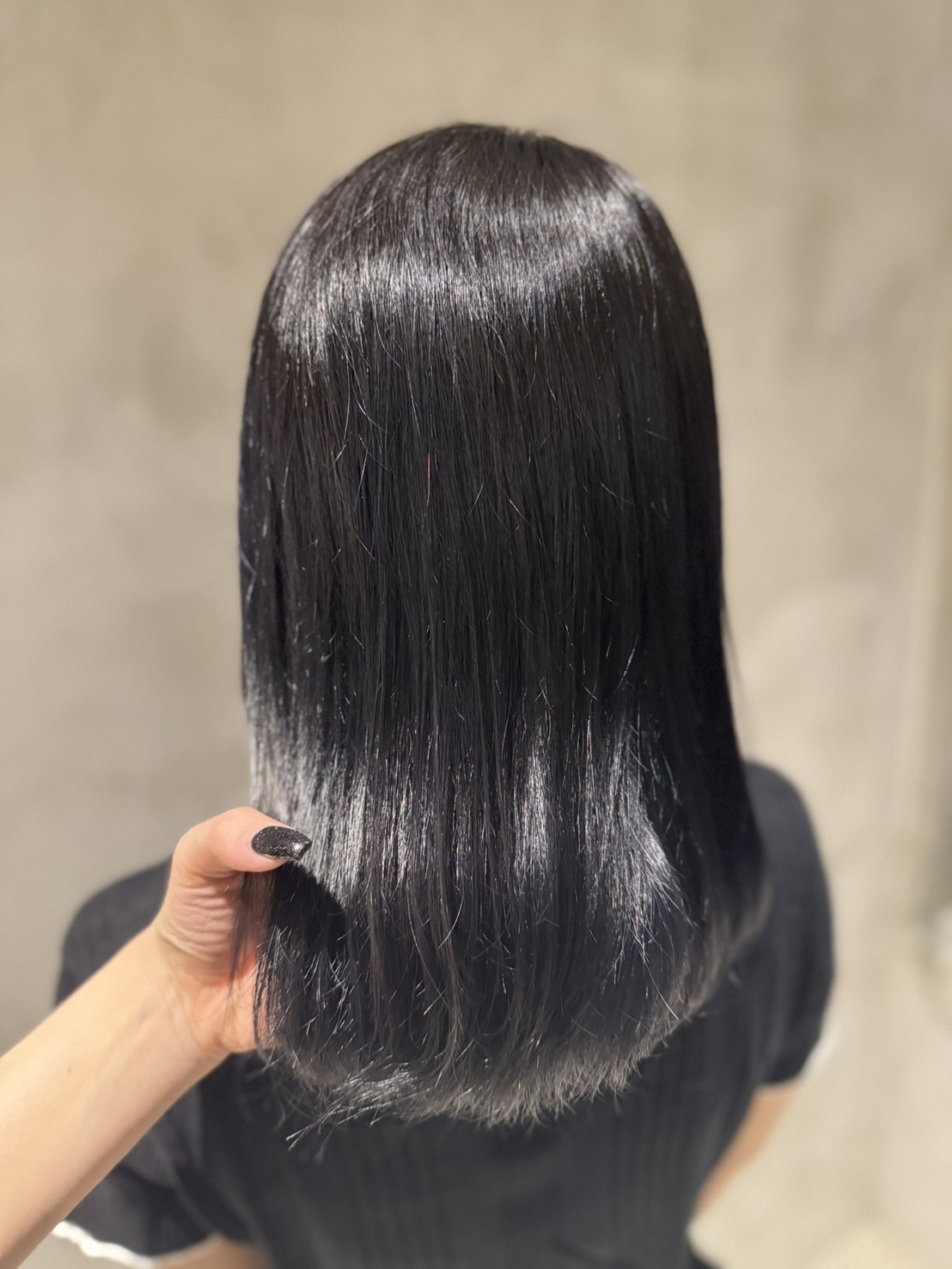 しかし、暗めのブルーカラー+適度なカット調整 を組み合わせることで、ツヤ感と扱いやすさを兼ね備えたスタイルが実現します。