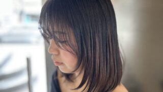 初めてのカラーで迷っている方へ。スタイリスト柳川が、縮毛矯正履歴を考慮した「ブリーチなしベージュ」をご提案。赤みやギラつきを抑え、重めパッツンカットでラインを活かしたスタイルに。神戸三宮211へ。