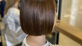 白髪が気になり出した方、久しぶりの美容室でスッキリしたい方へ。スタイリストMIYUKIが、以前のハイライトを活かして白髪を馴染ませる明るめのミルクティーカラーをご提案。襟足の毛量を調整したあごラインボブで、スタイリングが簡単な艶髪に仕上げます。