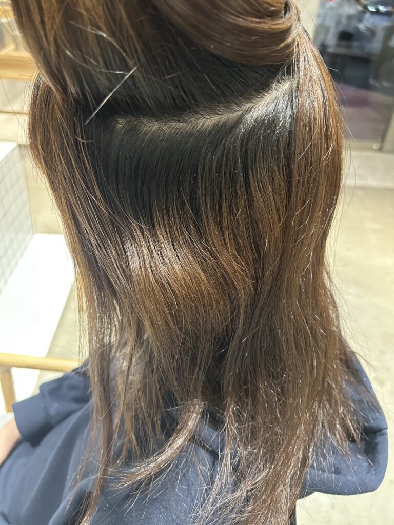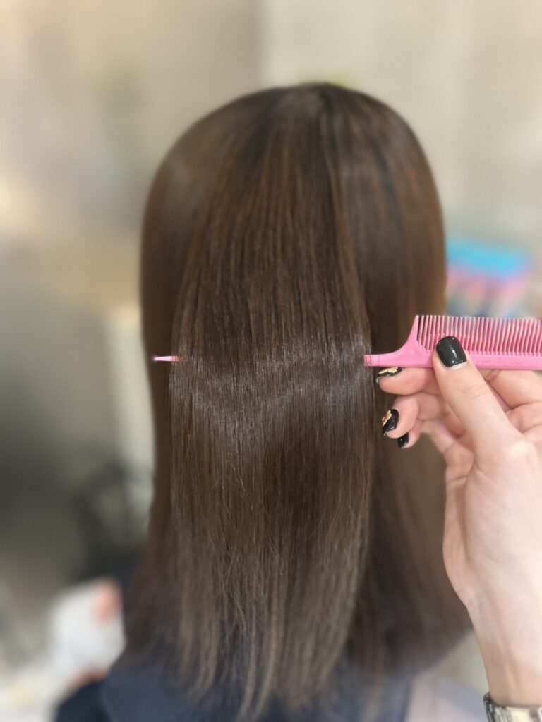 縮毛矯正は、髪の履歴に合わせた**「薬剤選定」**が命です。特にダメージが蓄積している髪には、無理に強い薬を使わず、場所によって細かく塗り分けることで、ダメージを最小限に抑えながら美しいストレートを作ります。