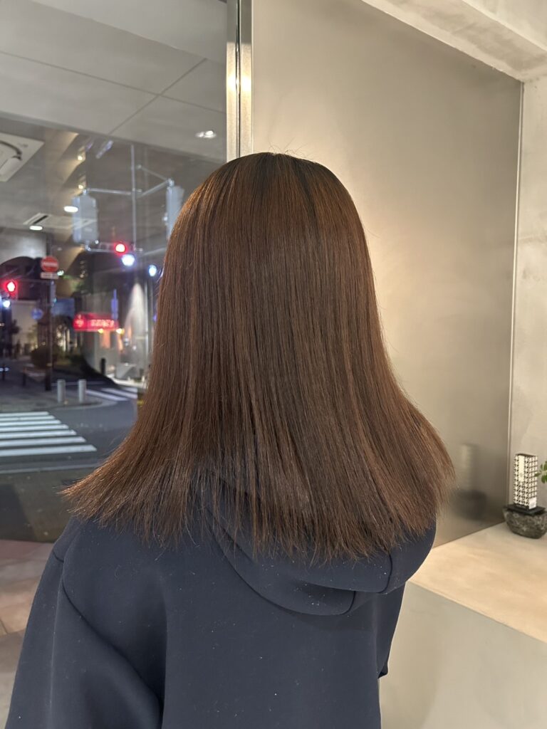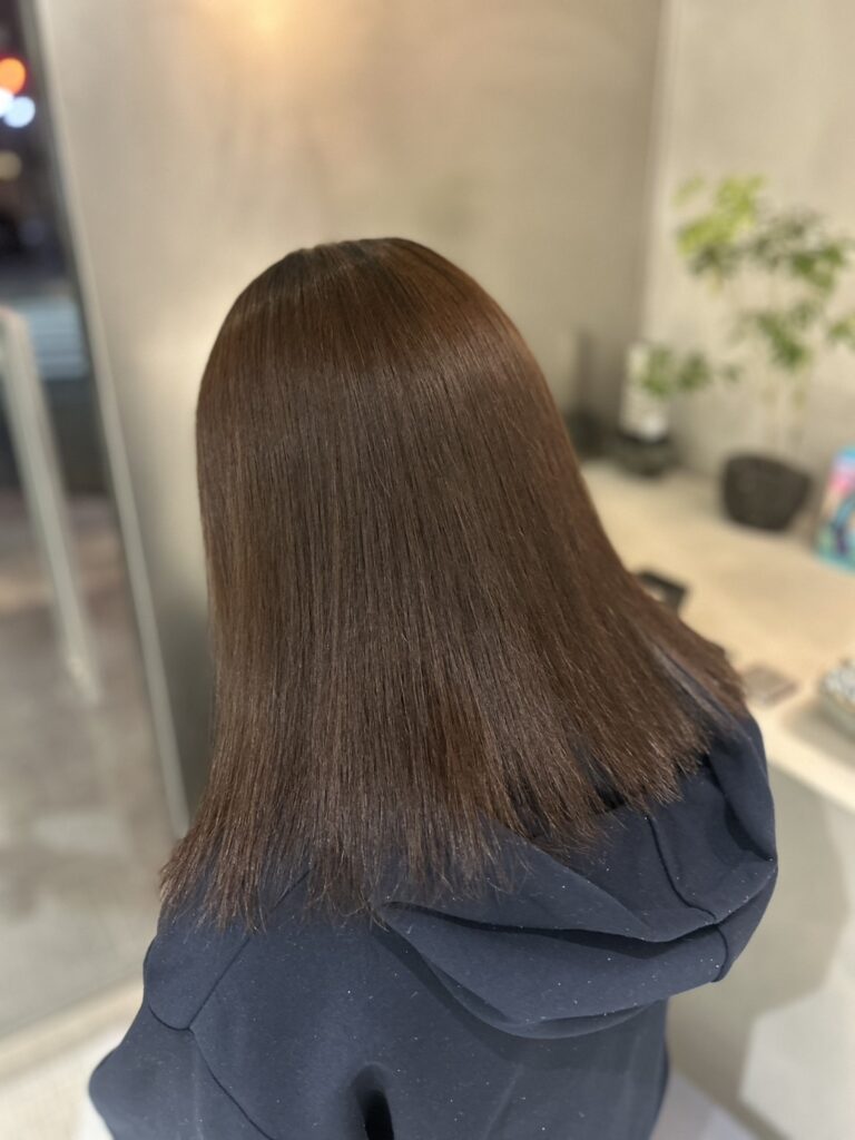 今回のメニューは**【縮毛矯正】**です。根元、中間、毛先それぞれの状態に合わせて、薬剤とアイロンワークを繊細に変えることで解決しました。
