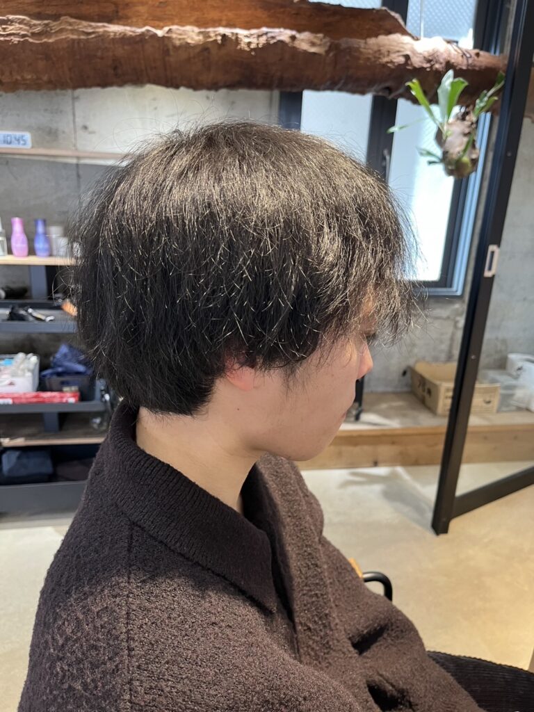 今回のメニューは**【カット+パーマ】**です。ただ短くするだけでなく、パーマの質感で「何もしなくても形になる」スタイルを作りました。
