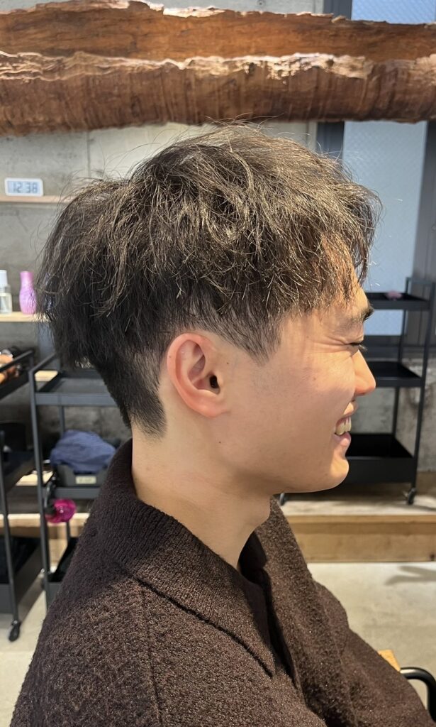 「セットしてもしなくても決まる」を実現するため、強めのツイストスパイラルパーマをかけました。 ツイスト(ねじり)の無造作な質感と、スパイラル(螺旋)の立体感が組み合わさることで、ワックスを揉み込めばバチッと決まり、何もつけなくてもラフな動きが出る万能スタイルです。