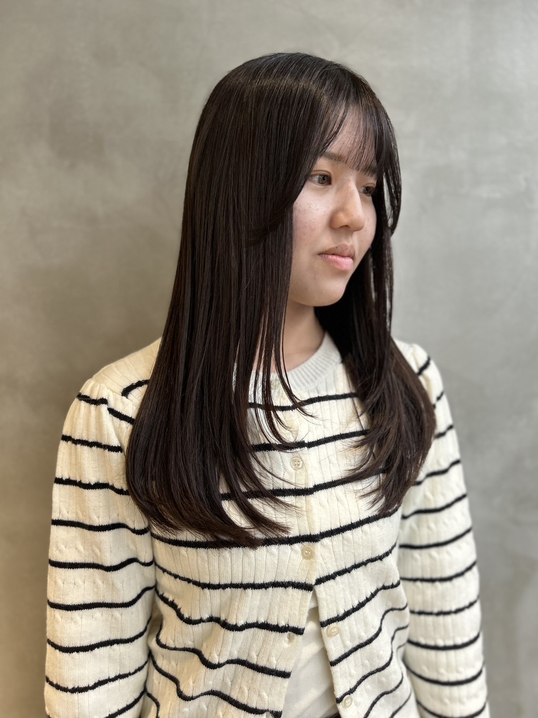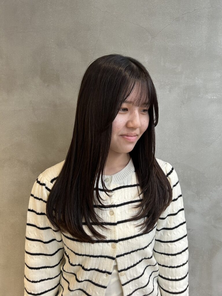 3. くくれる長さをキープ×顔周りレイヤー カットは、就活の必須条件である「後ろで一つにくくれる長さ」をしっかりキープ。 その上で、顔周りから毛先にかけて自然なレイヤー(段)を入れました。レイヤーを入れることで全体の重さが削られ、ストレートのままでも自然な動きが出て、アイロンで軽く巻いた時もふんわりと扱いやすいシルエットになります。