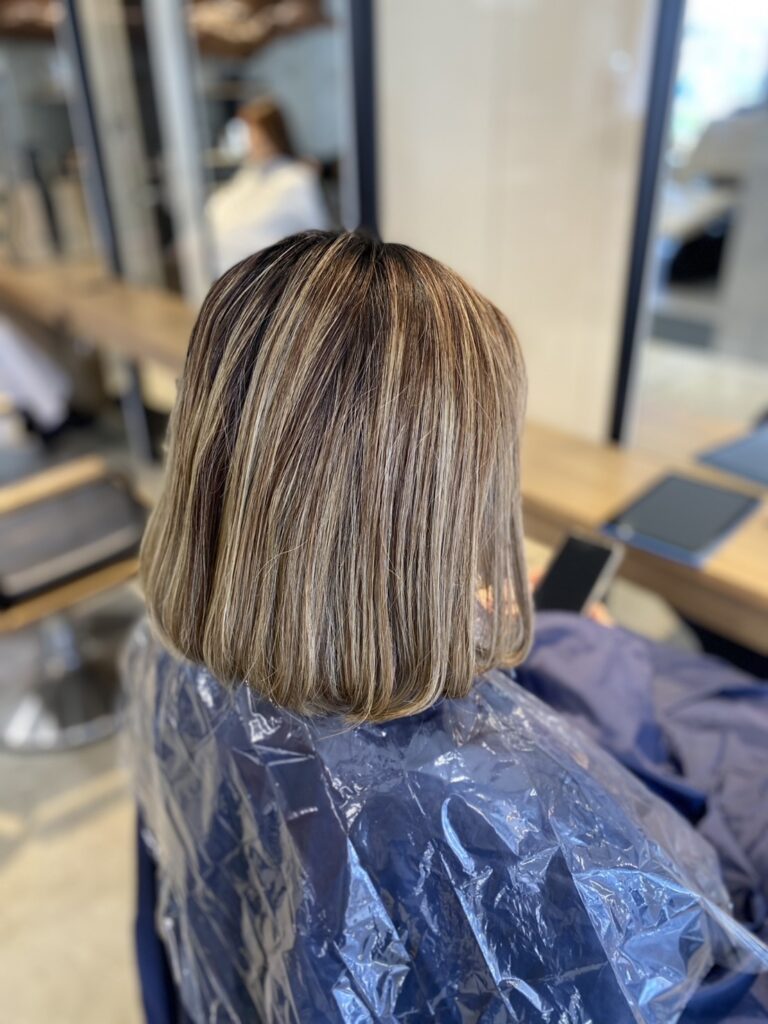 今回のメニューは**【カット+ハイライトカラー+トリートメント】**です。 「暗くする」と「白髪をぼかす」を両立させるため、デザインを再構築しました。