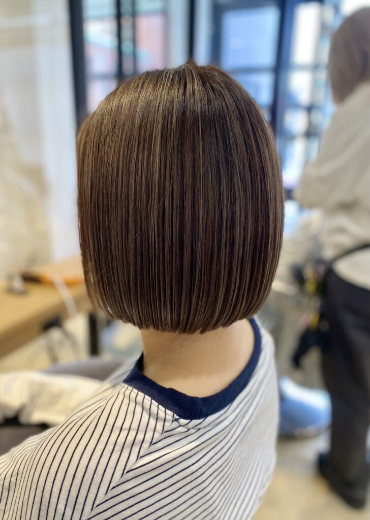 2. クセを抑える「重め」のミニボブカット 長さは、結べないくらいのスッキリとした「ミニボブ」に設定。 「広がるから重めがいい」というご要望を大切にしつつ、単に重いだけだと逆にボワッと膨らんでしまいます。 そこで、表面の重さは残してツヤを出しつつ、髪の内側で丁寧に毛量を整えることで、乾かすだけでストンとまとまる扱いやすいシルエットに仕上げました。