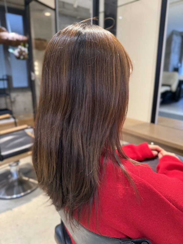今回のメニューは**【カット】**です。産後はなかなか美容室に来られないことも想定し、「伸びてもまとまる」&「小顔に見える」似合わせカットをご提案しました。