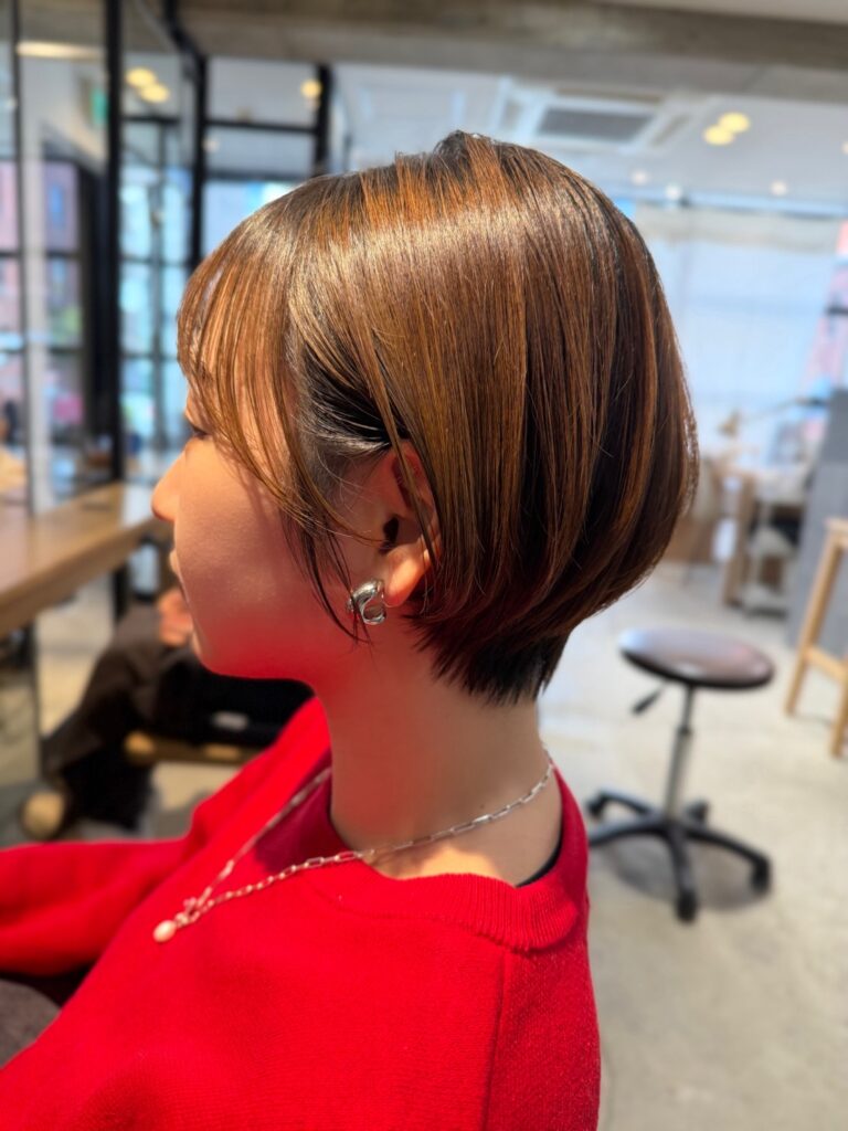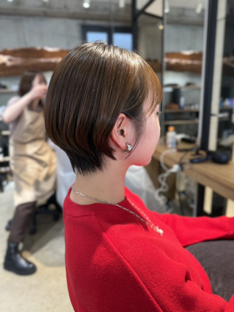 4年ぶりのショートということで、思い切って**リップライン(唇の高さ)**までバッサリとカットしました。 首元がスッキリすることで、ドライヤーの時間は大幅に短縮!産後の忙しい時期でも、パパッと乾かすだけで決まる長さに設定しています。