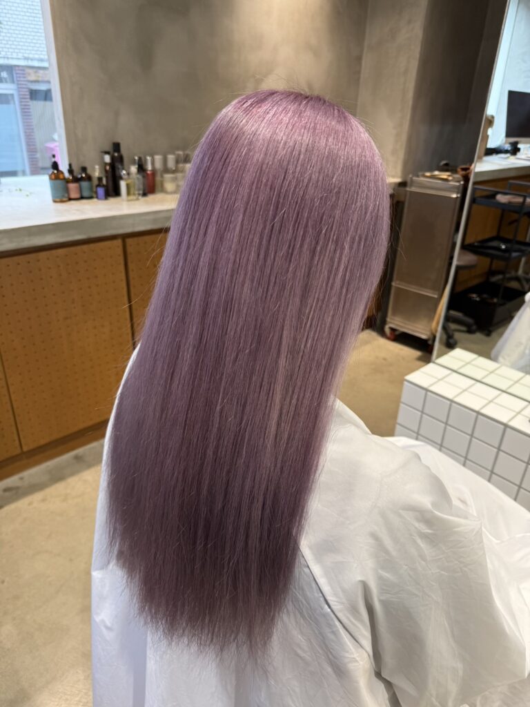 「明るさは残したい」というご要望を叶えるため、これまでの履歴を確認し、暗く沈みすぎないように明るさを調整しながらパープル系のカラーを選定しました。 パープルは黄ばみを消してくれる効果が高く、金髪特有の黄色っぽさを抑えて上品なツヤを出してくれます。