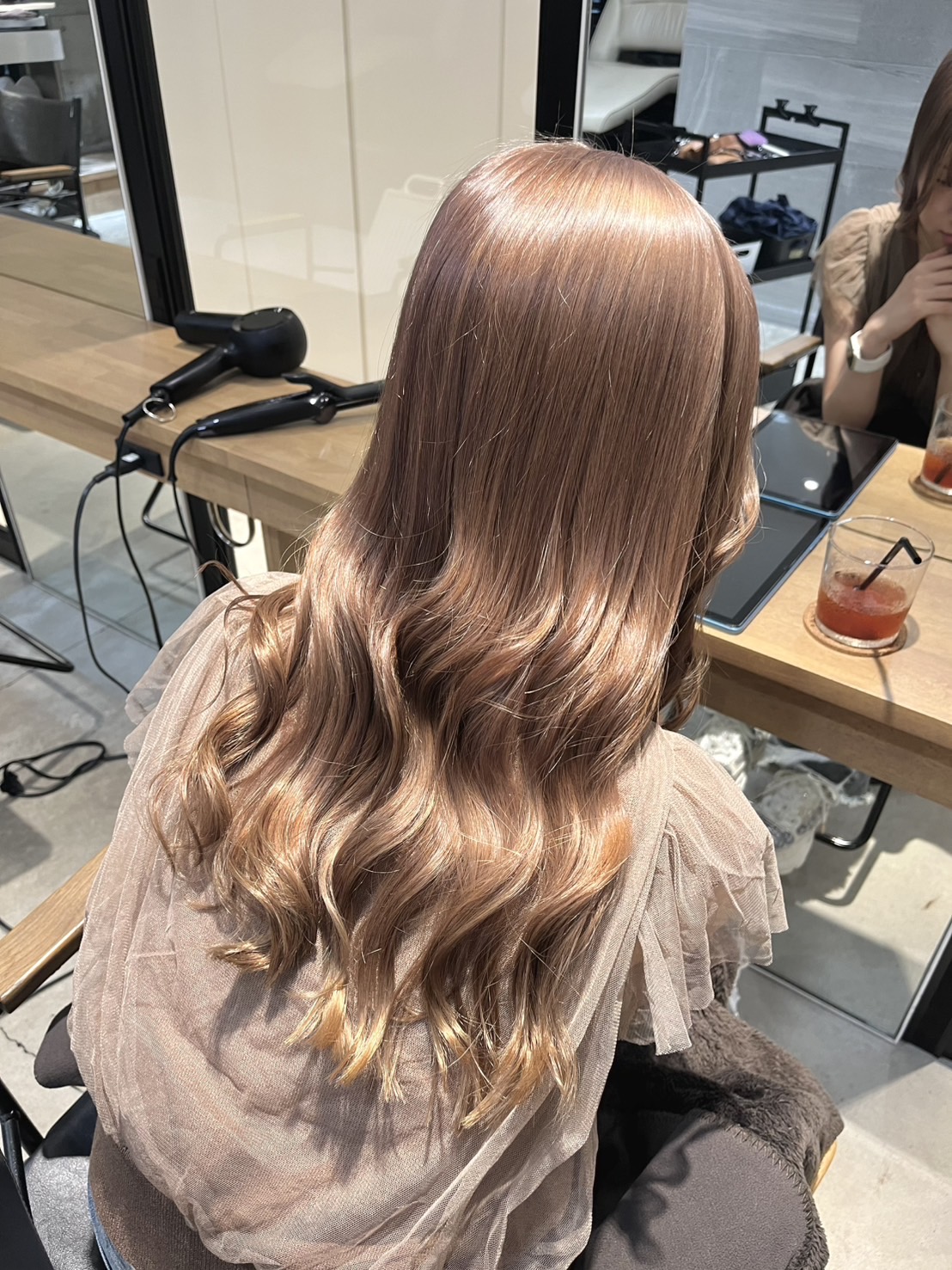 前回よりも明るくしたいとのことでしたので、一度ベースを明るくするダブルカラーをご提案。 色味はベージュをベースに、柔らかく見えるように調整。そこに、可愛さとツヤ感が出るように少しピンクを混ぜることで、ただ明るいだけでなく、女性らしく透明感のあるピンクベージュに仕上げました。