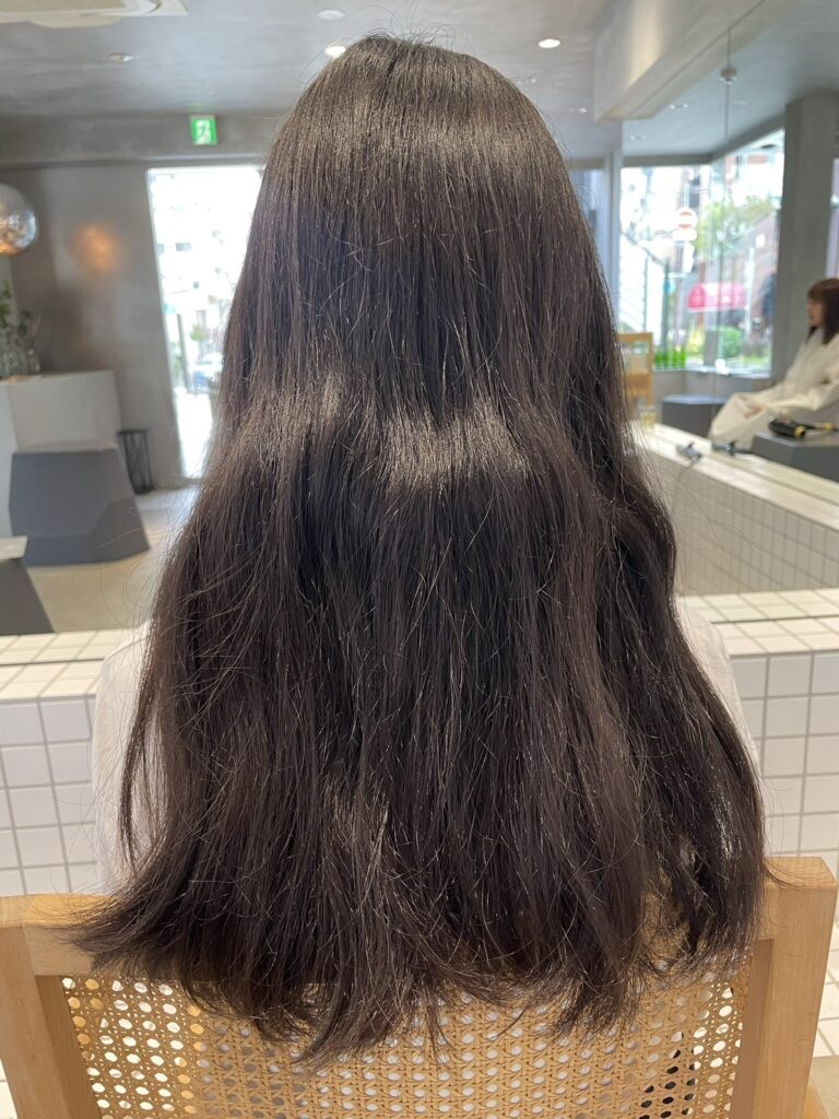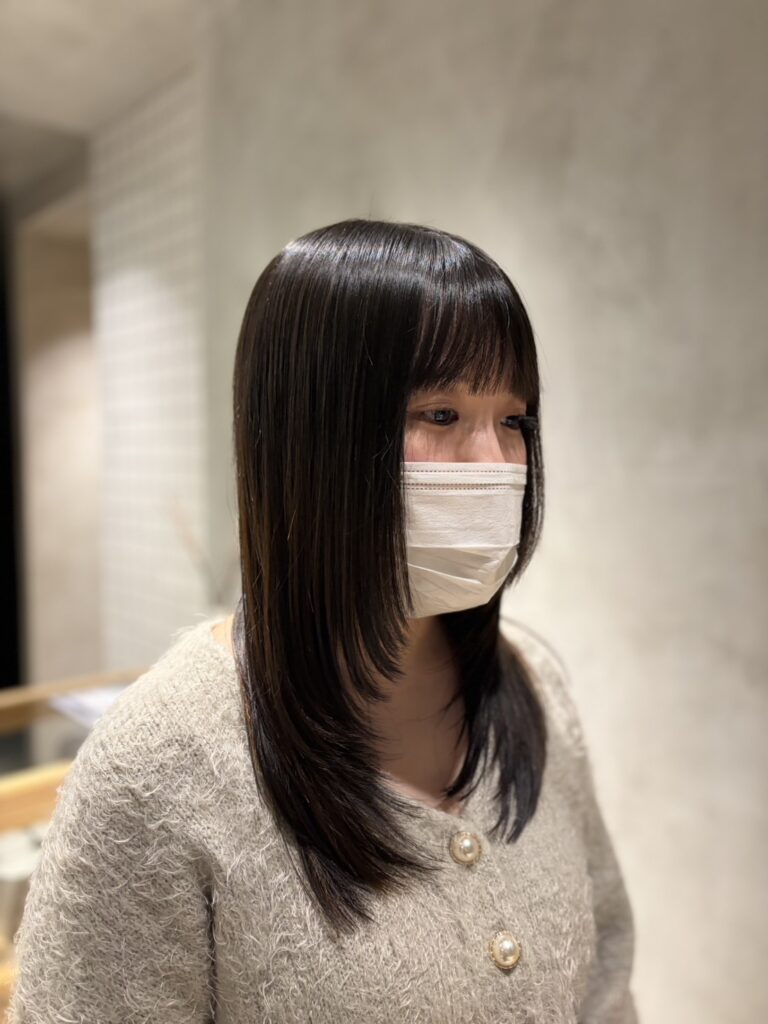 「長さは変えたくない」というご要望を大切にし、ベースの長さはそのままキープ。 その分、重く見えていた部分を中心に、表面と顔周りに控えめなレイヤーを入れました。全体の長さを切らなくても、表面の重なりを取るだけで、見た目の印象はグッと軽やかになります。