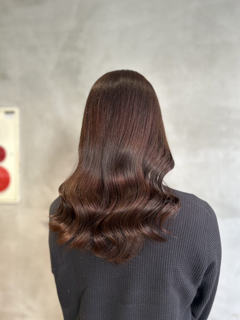 - 黒染めの重さが消え、ツヤと透明感あふれる上品な髪色に
