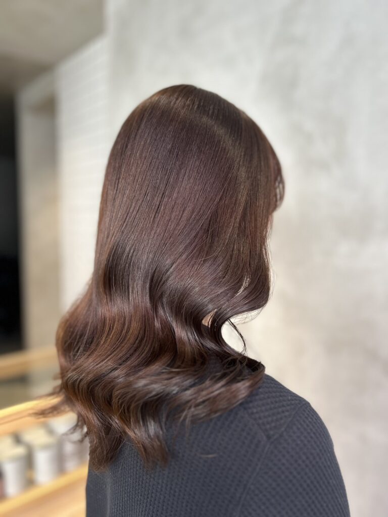 今回のメニューは**【カラー】**です。黒染め部分とそうでない部分の差を見極め、ムラなく上品に明るくする薬剤選定を行いました。