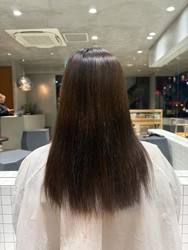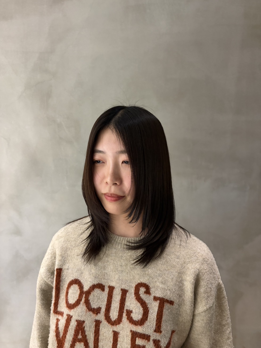 全体の長さはほとんど変えていませんが、前髪からサイドへ自然につながるようにカットすることで、正面から見た時の印象を大きく変えました。 顔周りに動きが出ることで、伸ばしかけの重たい印象がなくなり、トレンド感のあるスタイルになります。