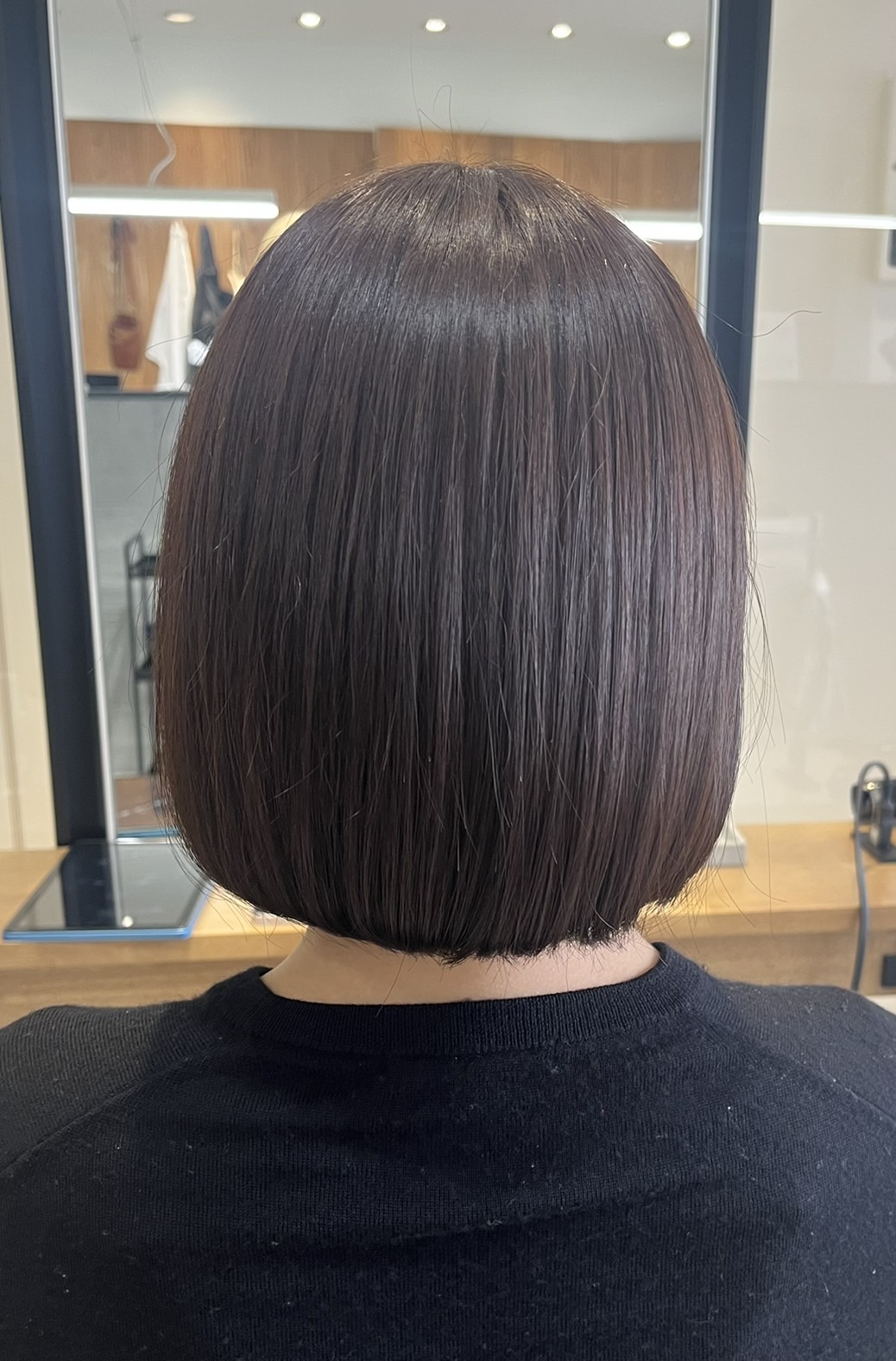3. トリートメントで「艶」をプラス カラーの仕上げにトリートメントで内部補修を行い、お客様が求めていた「艶」をしっかり引き出しました。 艶があることで、ボブのシルエットがさらに美しく際立ちます。