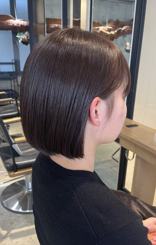 1. 乾かすだけでまとまる「厚みボブ」 ロングからボブへバッサリとカット!短く切ると広がりやすくなるのが心配ですが、今回は毛先に「厚み」を残すことで重みでストンと落ちるように計算しています。 さらに、乾かすだけで自然と内側に入りやすいラインに整えたので、お仕事前の忙しい朝でも扱いやすい形に仕上げました。