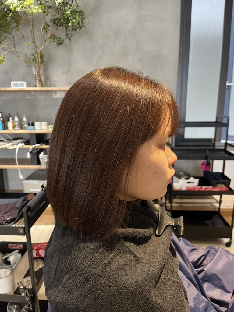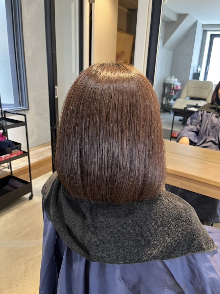 今回のメニューは**【カット+カラー+トリートメント】**です。 「艶」と「まとまり」を最優先に施術を行いました。