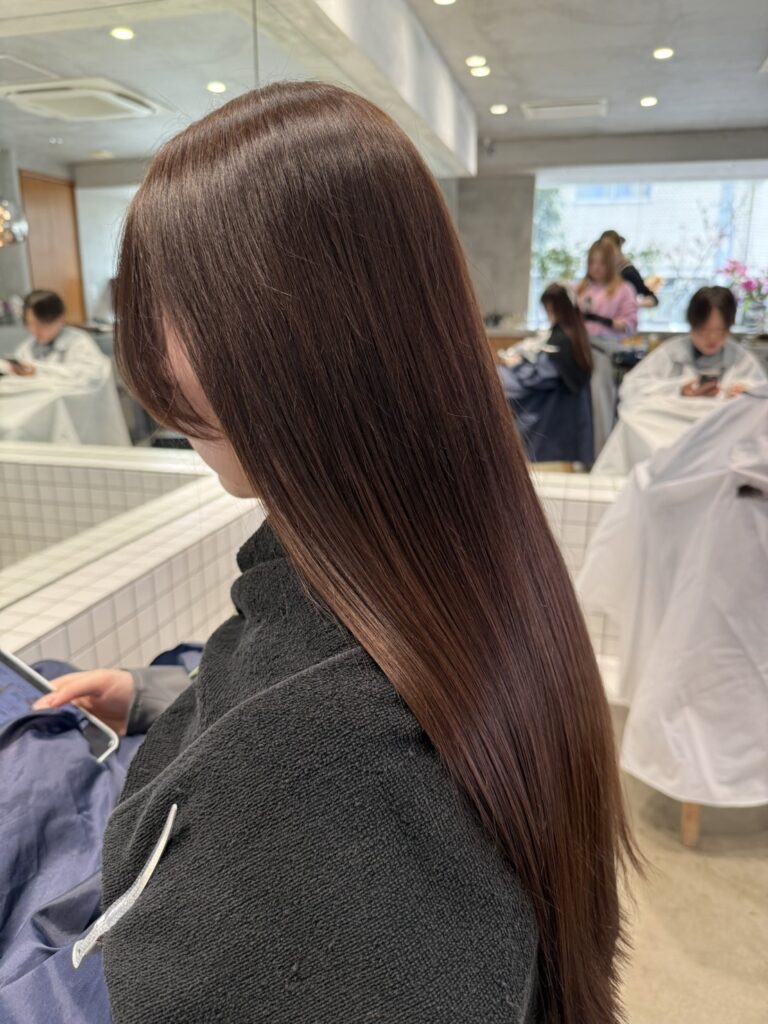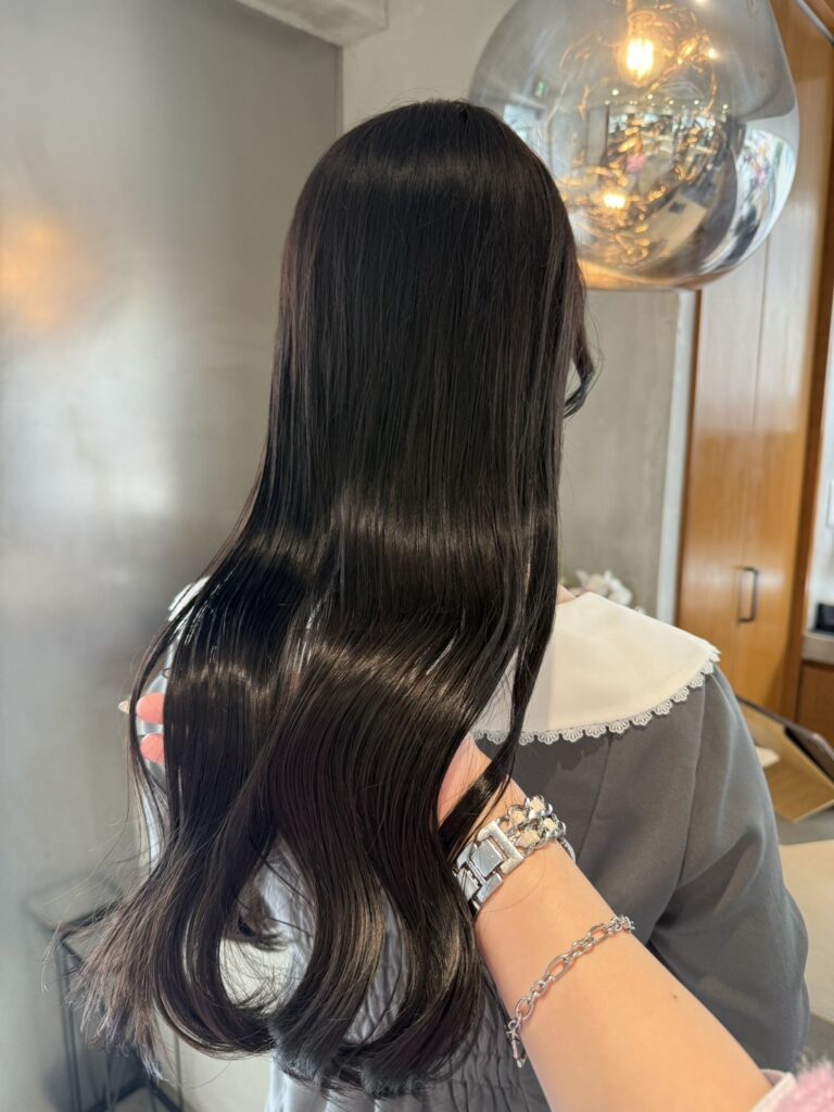 今回のメニューは**【カラー+トリートメント】**です。 「暗くても透明感がある」という絶妙なバランスと、色持ちの良さを重視して施術を行いました。