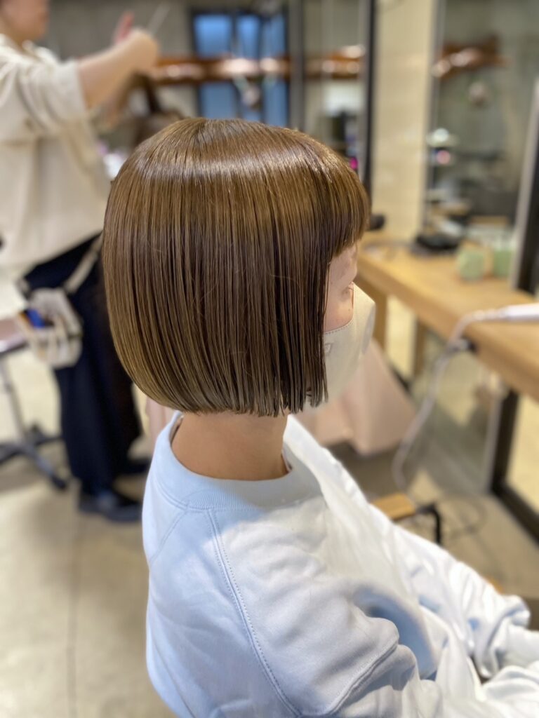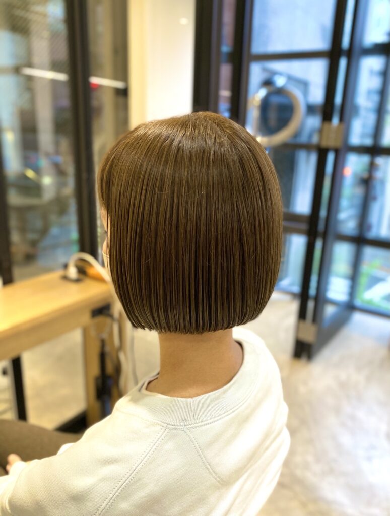 「できる限り短く」というご希望にお応えし、襟足ギリギリのラインでカット。 パツンとしたラインが出るように切り揃えつつ、お客様のナチュラルな癖を活かして自然にまとまるように整えました。癖を味方につけることで、スタイリング剤をつけるだけで可愛くなるボブです。