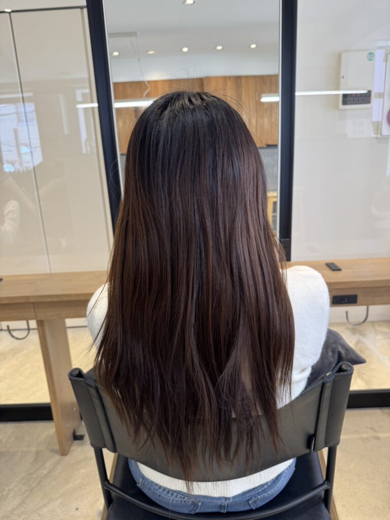 今回のメニューは**【カット+カラー+トリートメント】**です。 「プリンの解消」と「柔らかい透明感」をテーマに施術を行いました。
