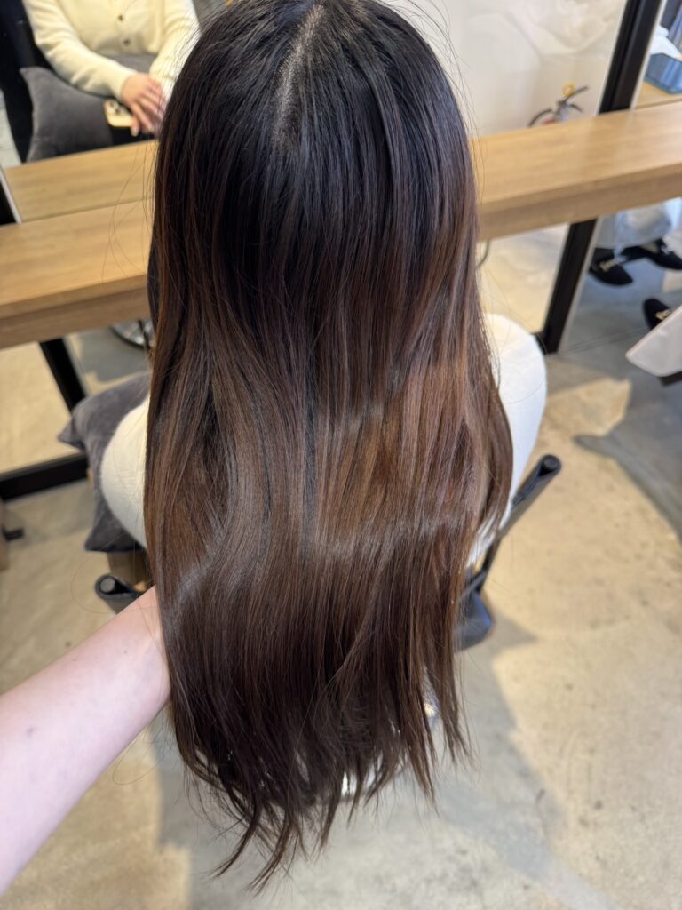 1. 伸びても気にならない!絶妙な「7トーン」設定 毛先が明るく退色していると、新しく生えてきた根元(黒髪)とのコントラストでプリンが余計に目立ってしまいます。 かといって暗くしすぎると毛先だけが沈んでグラデーションのようになってしまい、明るくしすぎるとまたすぐにプリンが気になってしまいます。そこで今回は、根元と毛先が自然に馴染み、次に伸びてきても目立ちにくい**「7トーン」**の明るさを目指してカラーを調整しました!