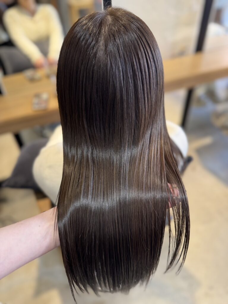 - 根元から毛先まで綺麗に繋がった、ツヤ感たっぷりの「オリーブベージュ」に✨