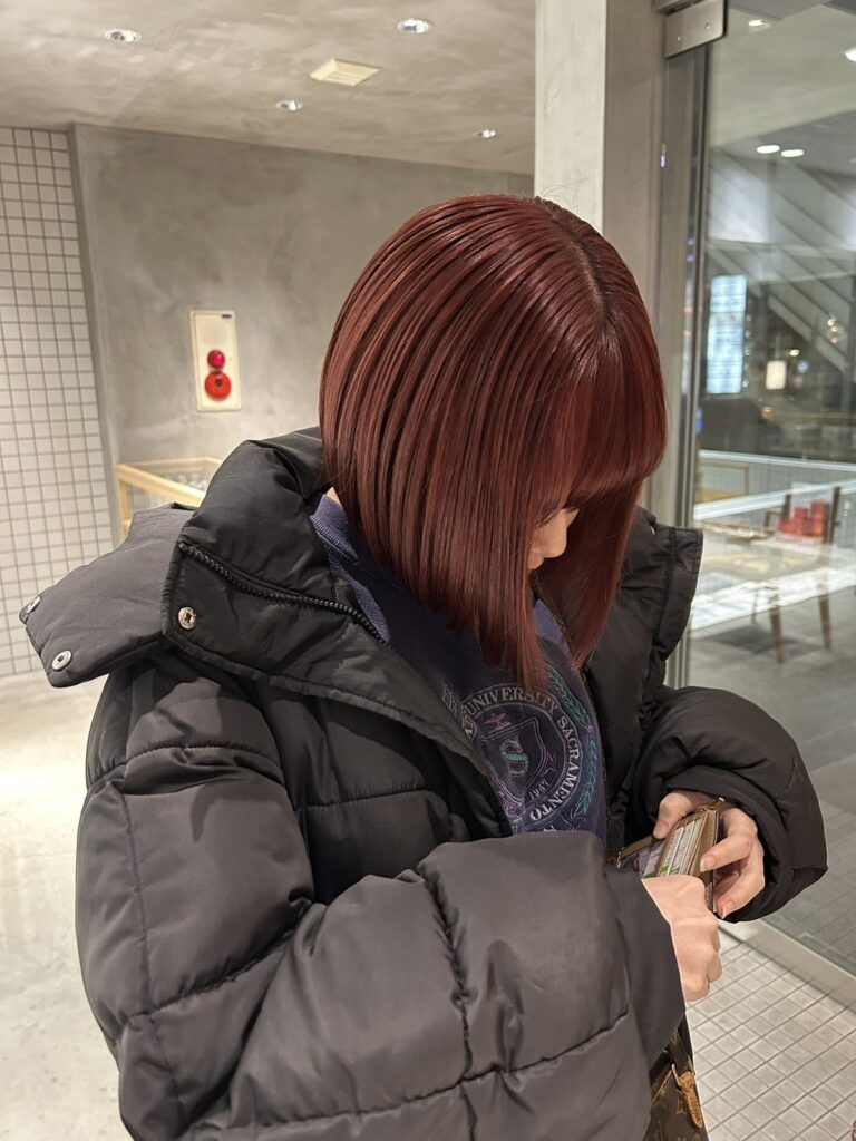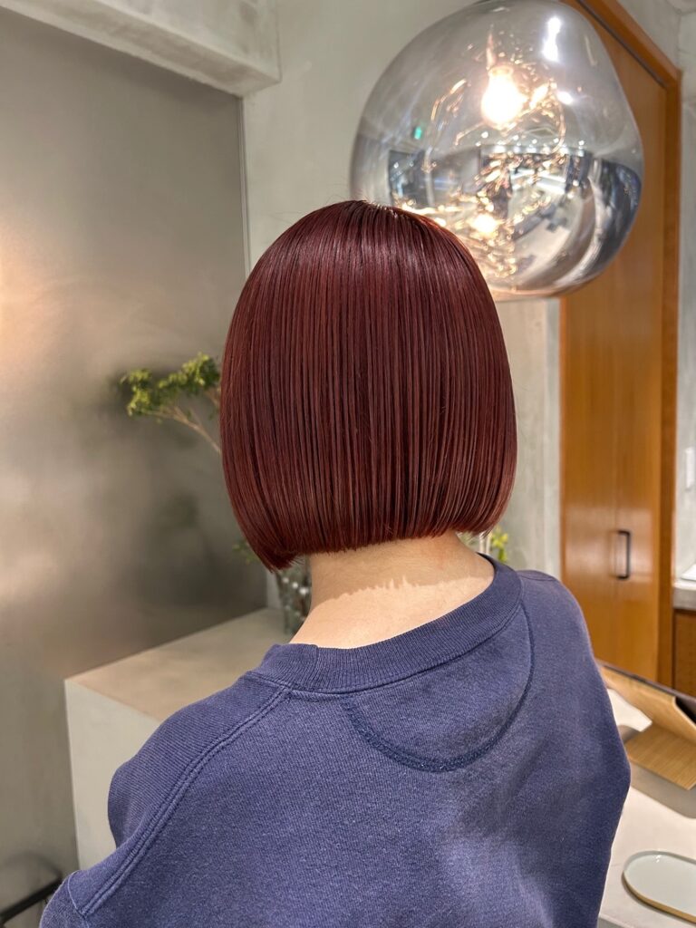 今回のメニューは**【ワンメイクカラー】**です。薬剤の配合を工夫することで、複雑なブリーチのムラを修正しつつ、理想の「大人の赤」を作りました。
