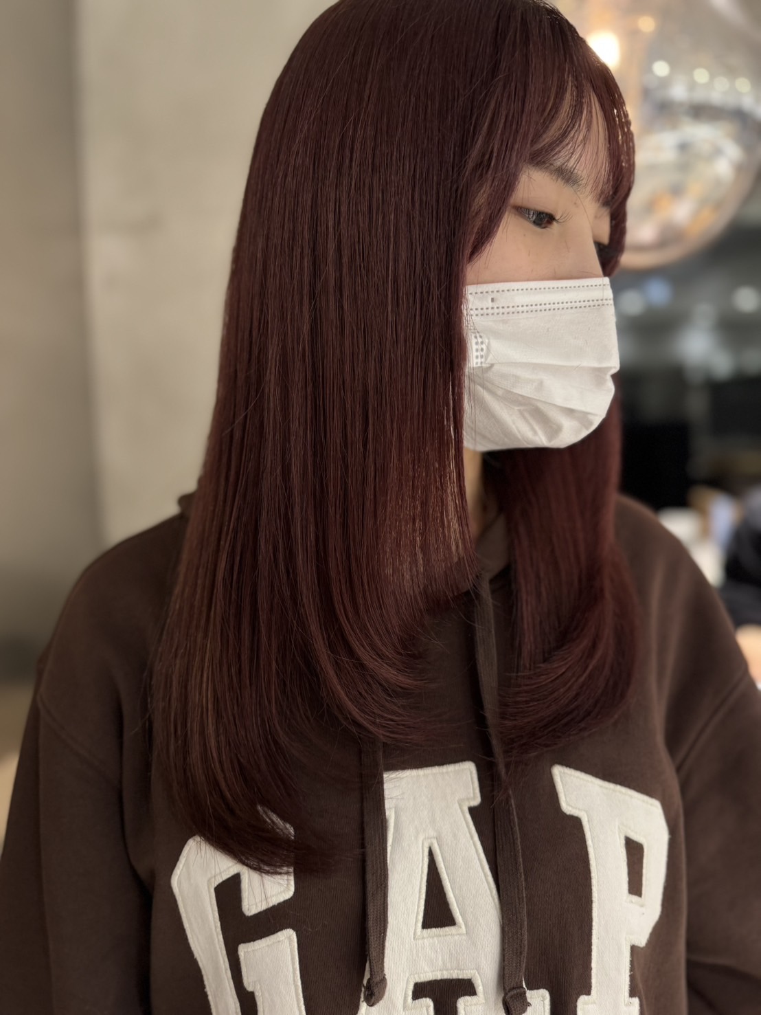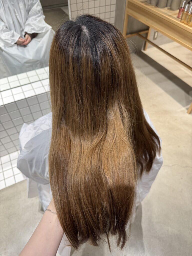 「就職があるから黒染め!」ではなく、ブリーチベース特有の色が入りやすい状態を活かして、**少しだけベースを暗くした「落ち着いたピンクベージュ」**にしました。 いきなり暗くしすぎず、段階を踏んでトーンを落としていくことで、透明感を残したまま自然に落ち着いた印象へシフトできます。