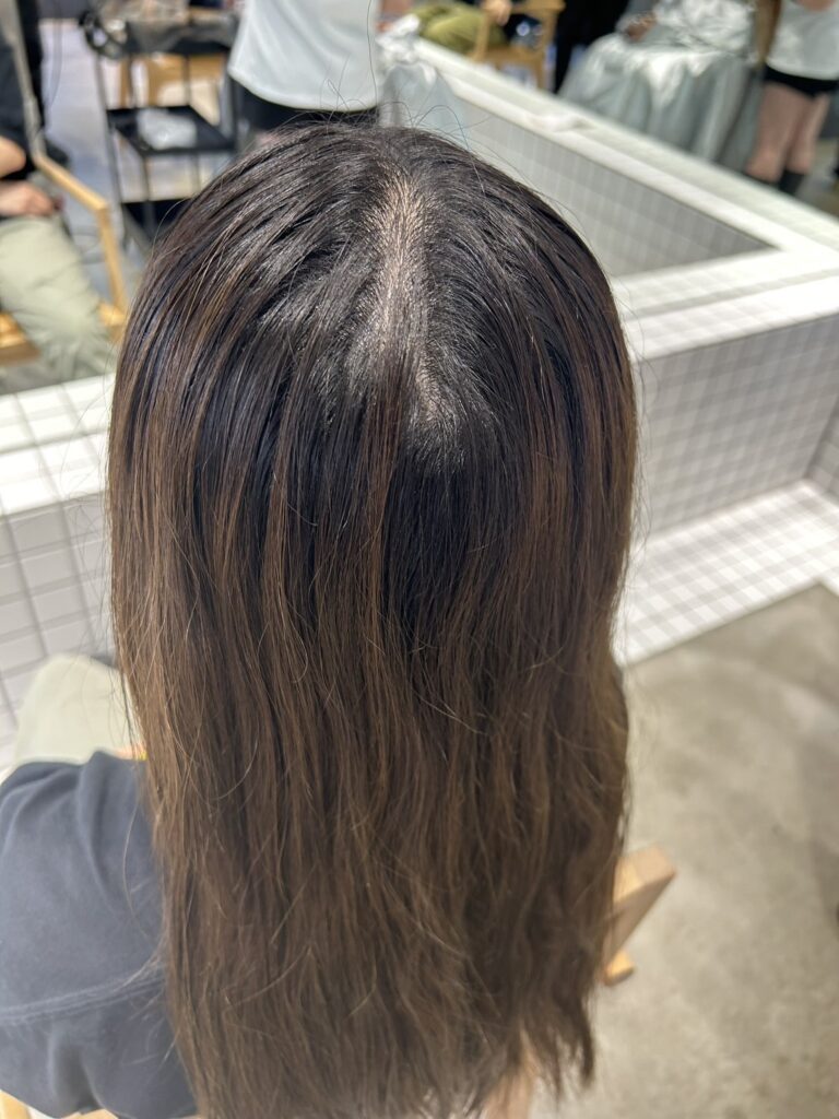 半年分の伸びた黒髪と、明るくなった毛先では、薬の吸い込み方が全く違います。 そこで、根元と毛先の明度差を計算し、境目が目立たず自然に繋がるように薬剤を配合しました。これにより、ぱっくり分かれていたプリン状態が解消され、均一なベースが完成します。