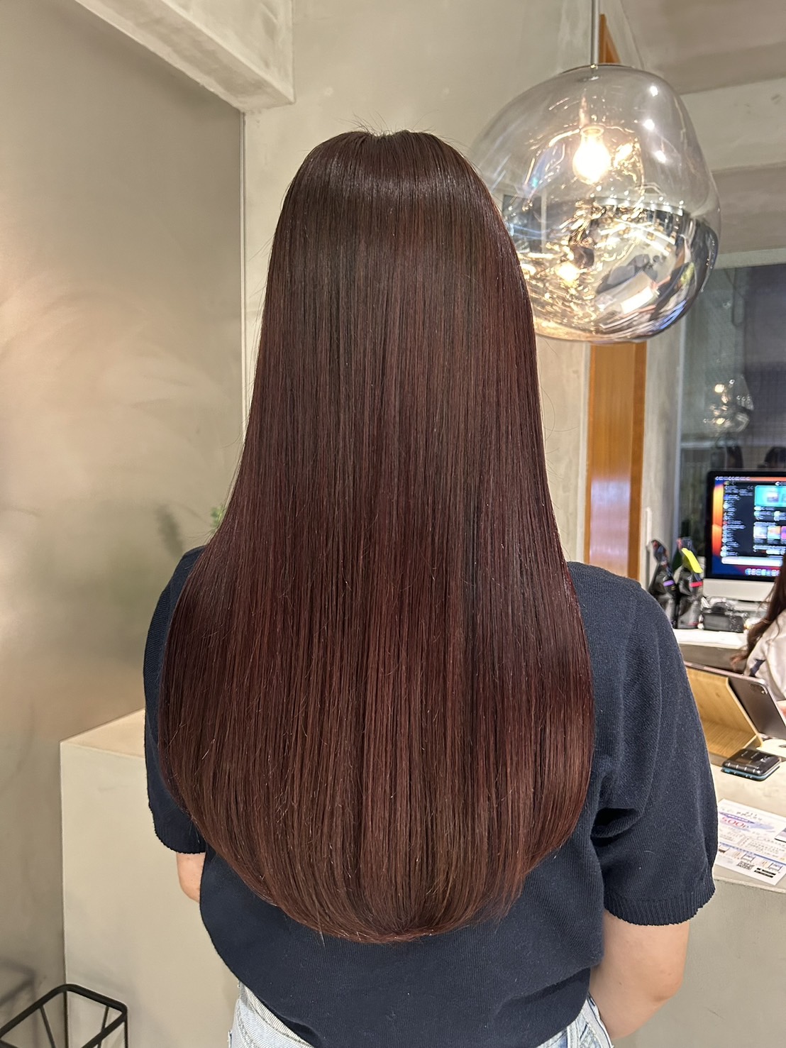 - 透明感のあるレッドカラーで、圧倒的なツヤ髪が復活