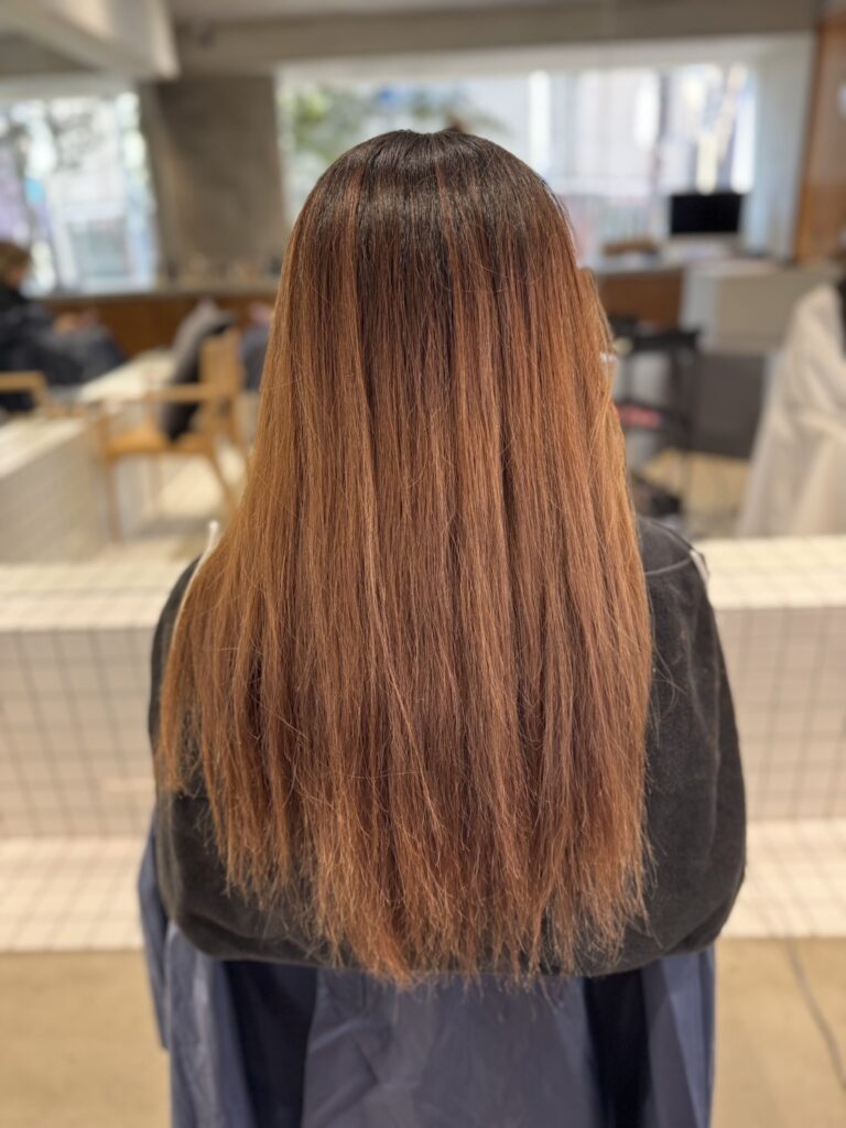今回のメニューは**【カット+カラー】**です。 お客様の髪のダメージ状態を見極め、ツヤ感とまとまりを最優先にした施術を行いました。