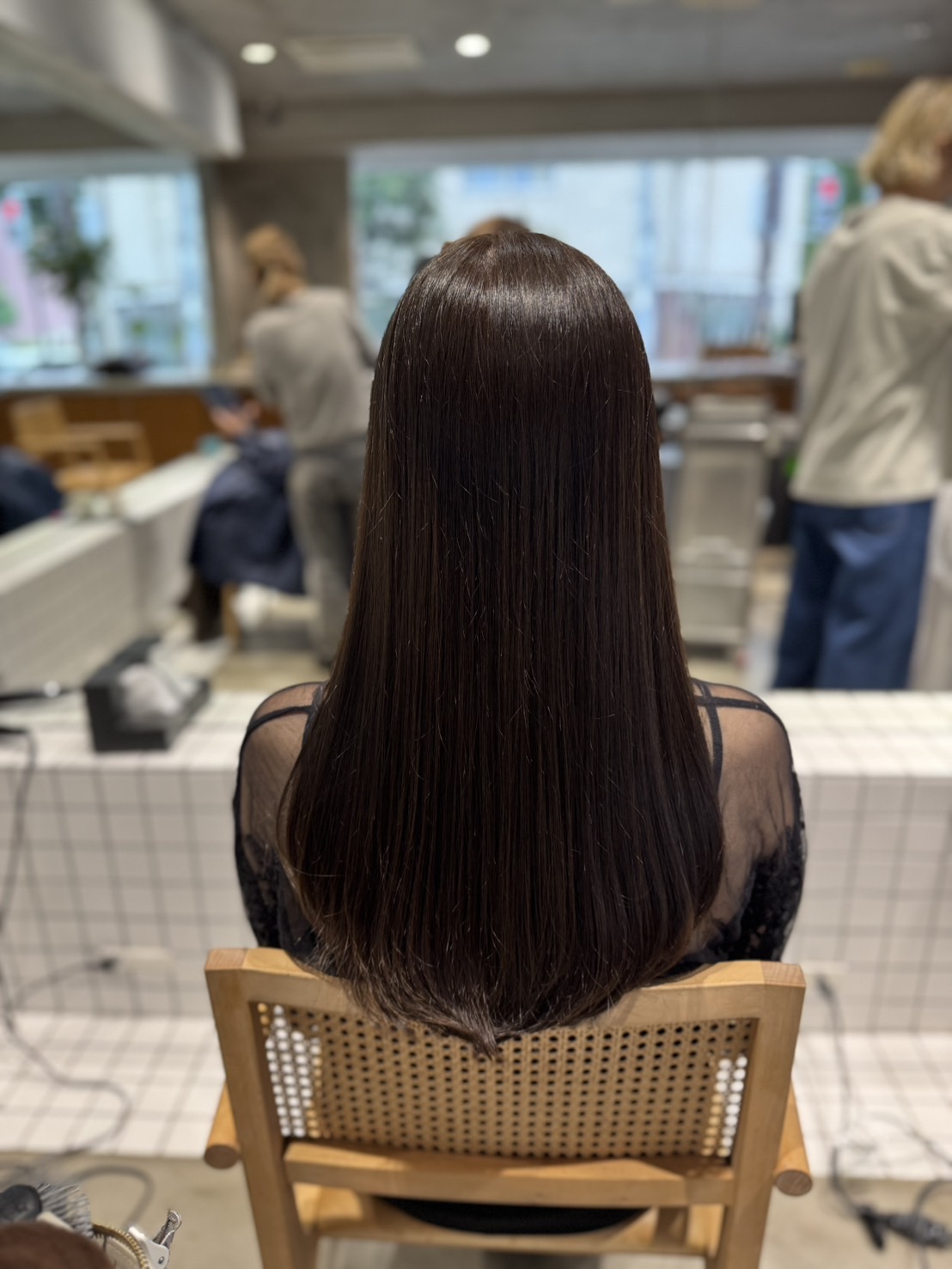 今回のメニューは**【カット+カラー】**です。 お客様の髪のダメージ状態を見極め、ツヤ感とまとまりを最優先にした施術を行いました。