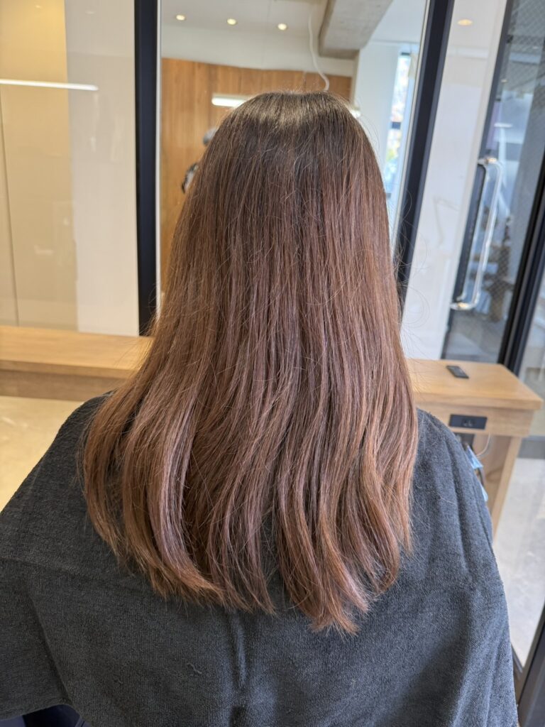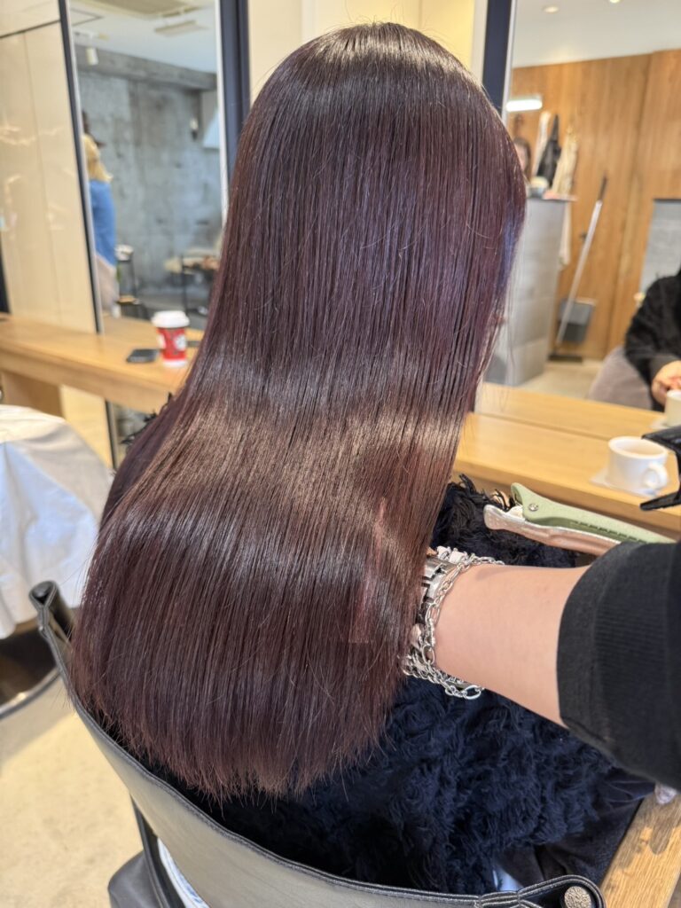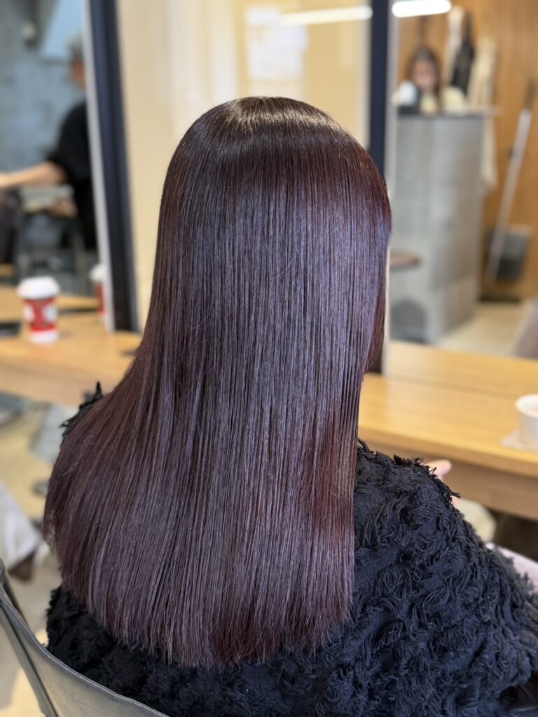 今回のメニューは**【カラー+カット】**です。ただ暗くするだけでなく、ストレートヘアが最も美しく見える質感作りこだわりました。