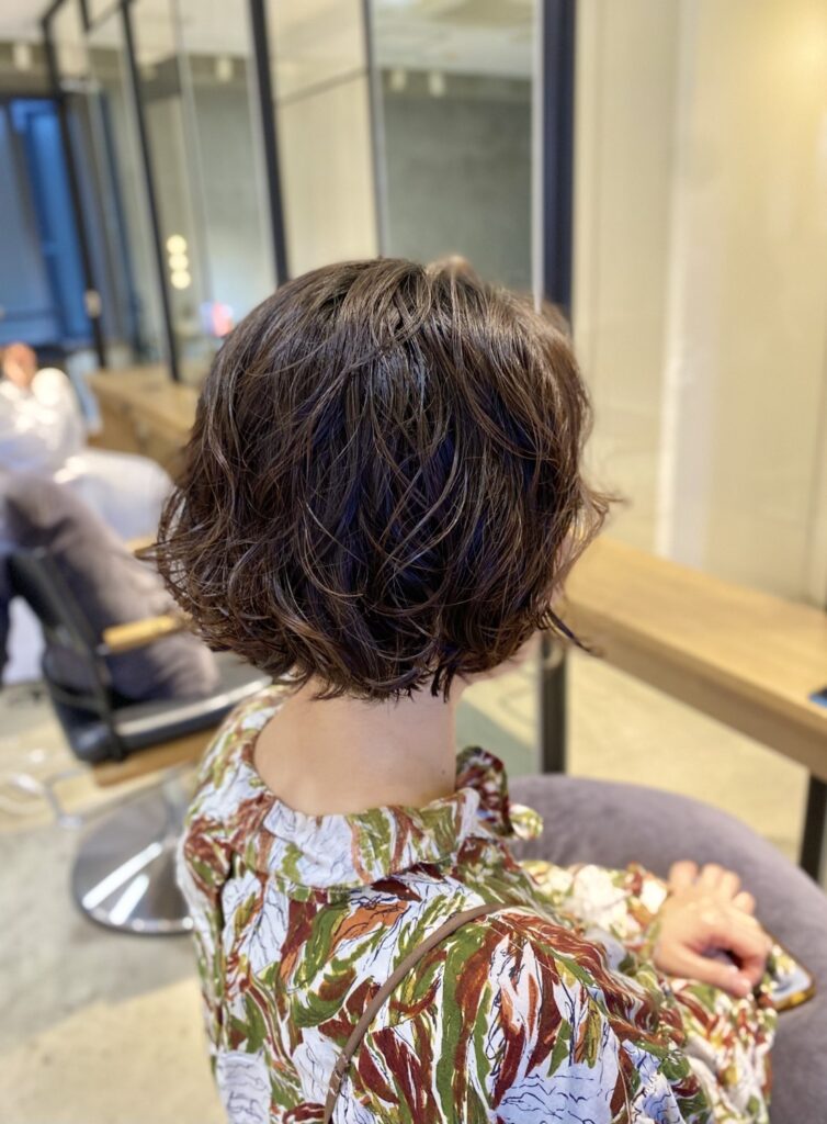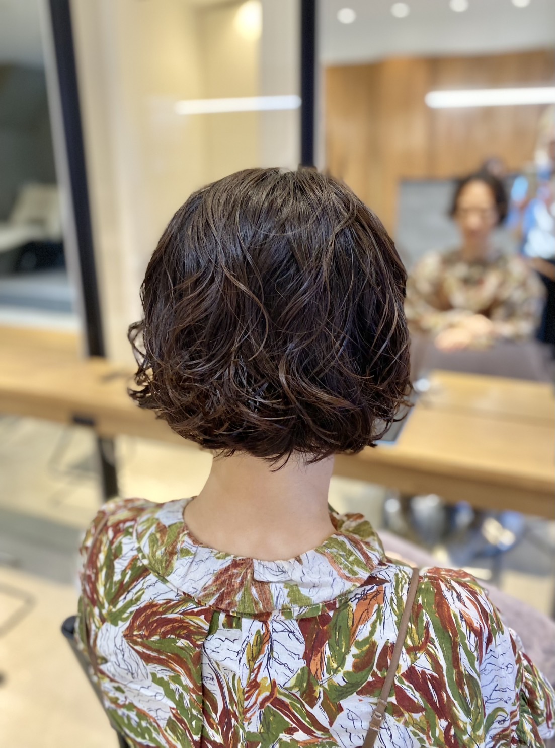 今回のメニューは**【カット+パーマ+トリートメント】**です。 「スッキリ感」と「朝ラク」を両立するスタイルをご提案しました。