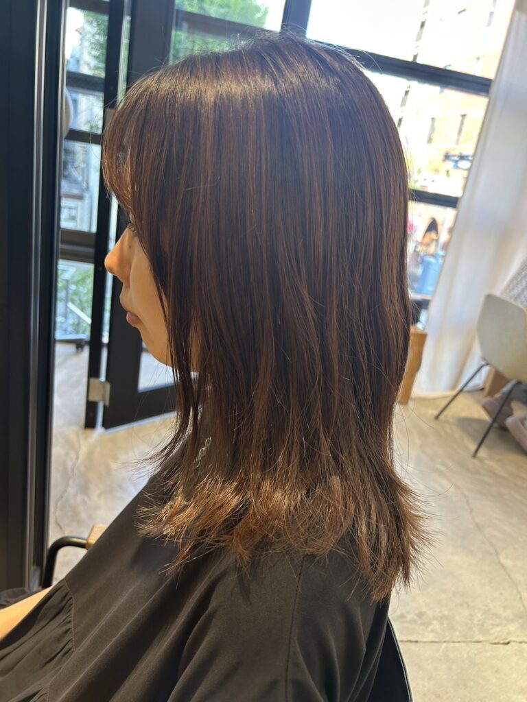暖色カラーの最大のメリットは「ツヤ」です。 特に今回は紫みをミックスしているため、光を綺麗に反射し、パサついて見えがちな髪も潤いのあるツヤ髪に見せてくれます。