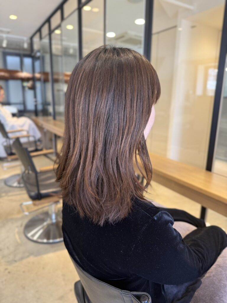 3. 透明感と色持ちを両立「アッシュ×パープル」 カラーは、赤みを消す「アッシュ」と、黄色っぽく抜けるのを防ぐ「パープル」をミックス。 暗すぎない落ち着いたトーンですが、光に当たると透けるような透明感が出ます。 パープルが入ることで、色が抜けていく過程も綺麗(色持ちが良い)なのが特徴です。