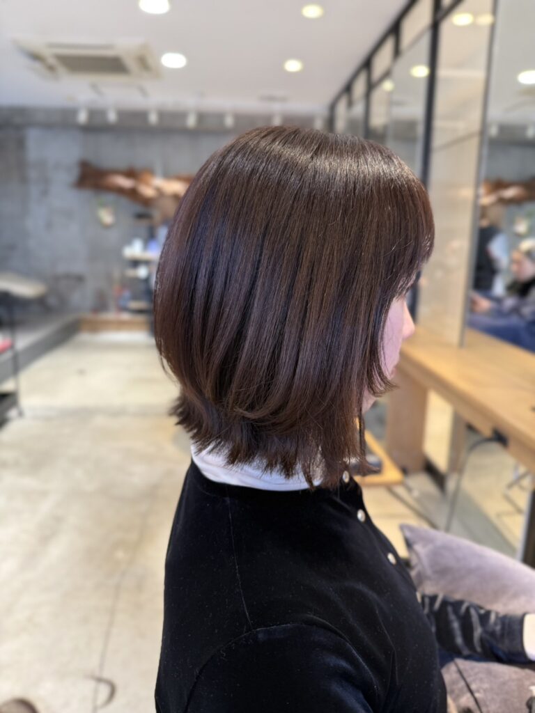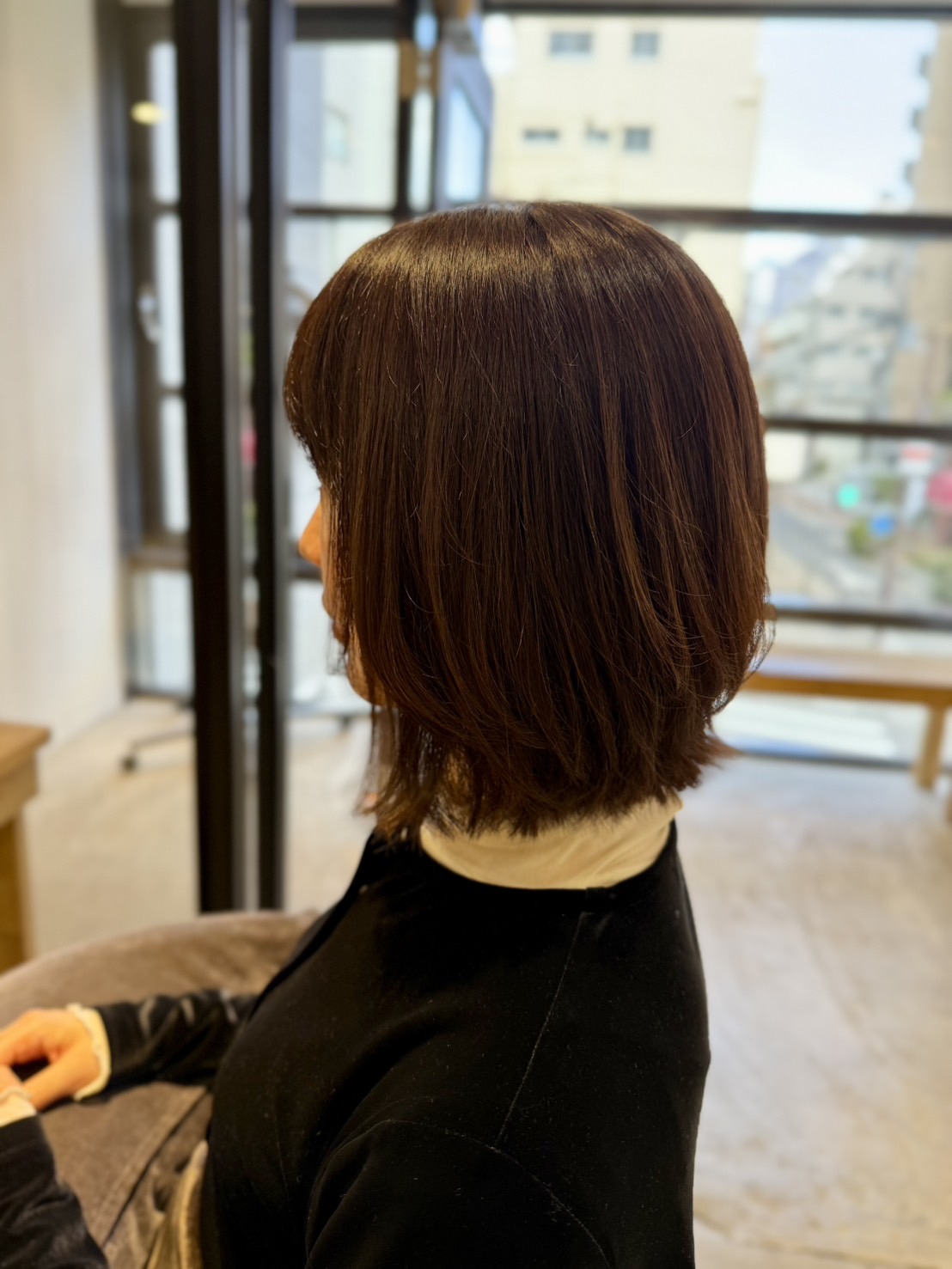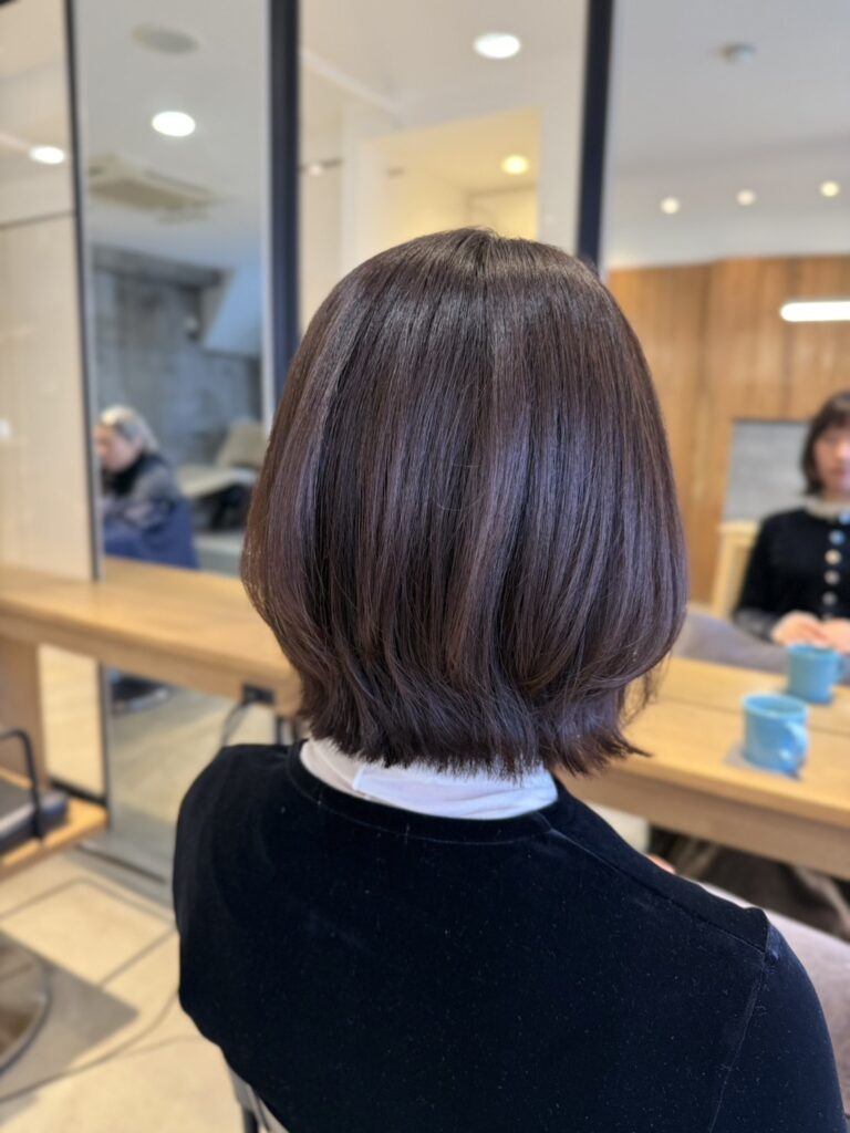 今回のメニューは**【カット+カラー+トリートメント】**です。 お客様の「骨格」と「髪質」を見極め、オーダーメイドのボブを作りました。