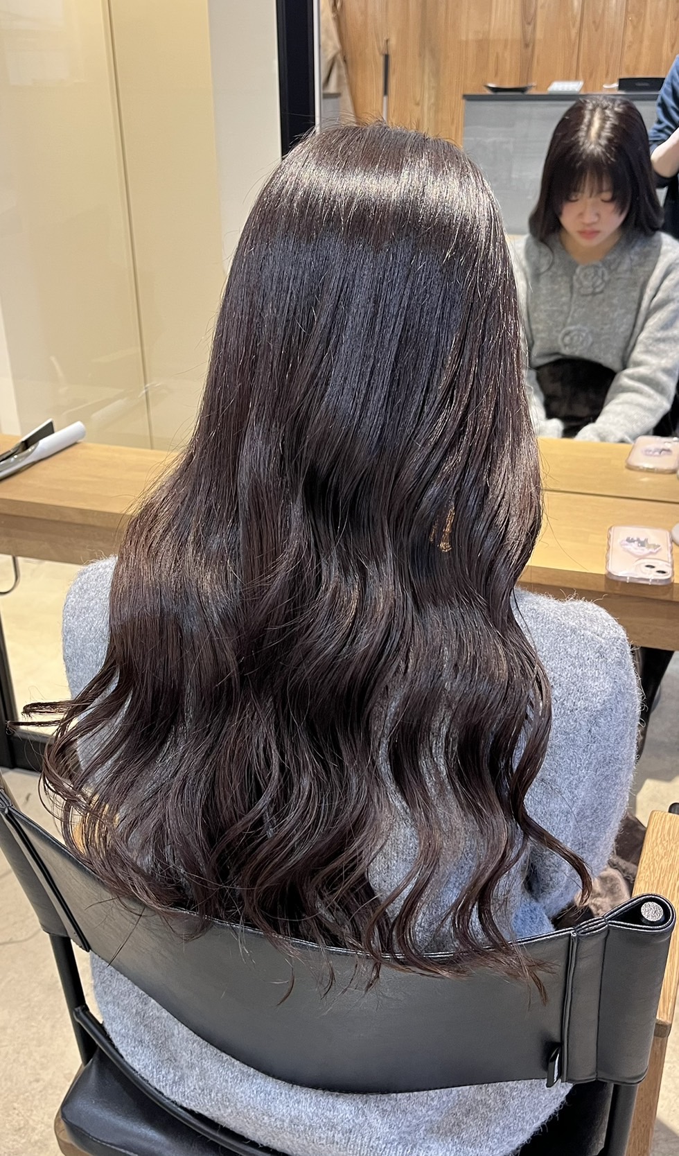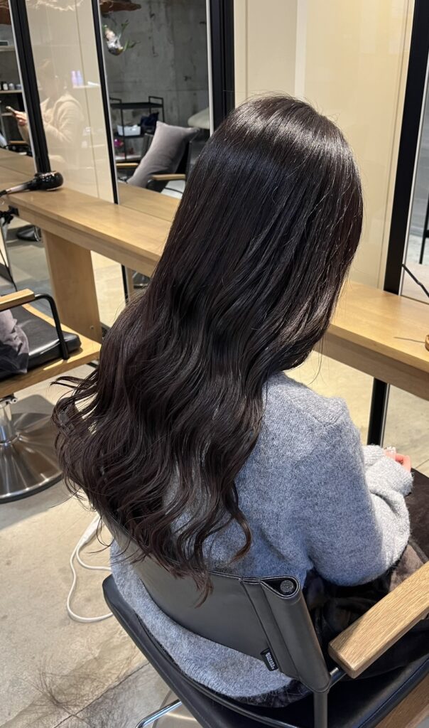2. 赤みを消す「暗めグレー」で透明感を 退色してオレンジっぽく明るくなっていた髪に、少しトーンを落とした**「暗めのグレー」**をオン。 日本人の髪特有の赤みをしっかり抑えることで、暗くても重たくならず、透き通るような透明感が生まれます。