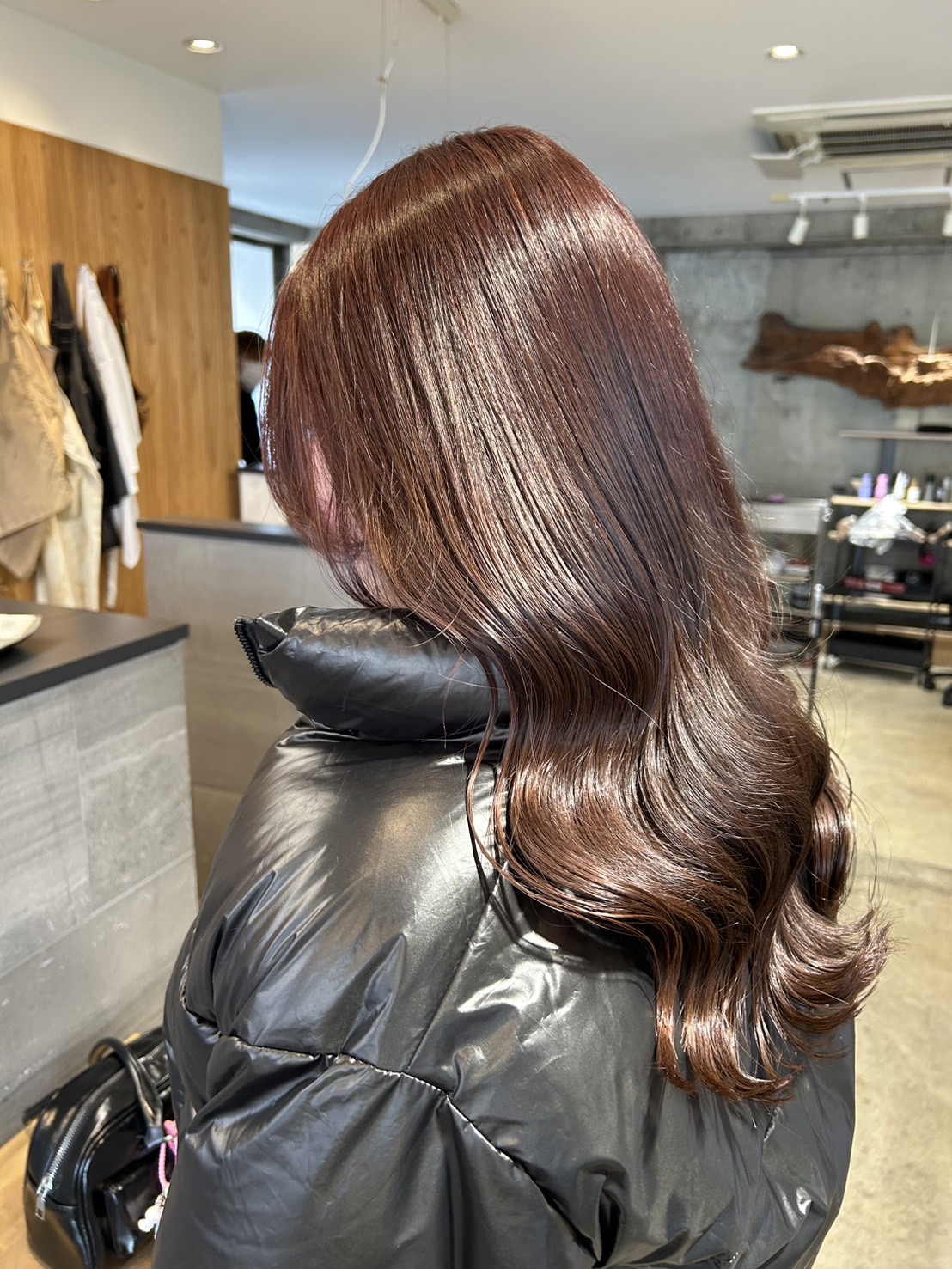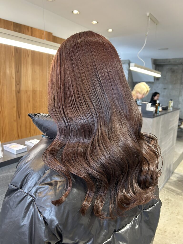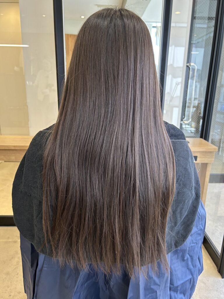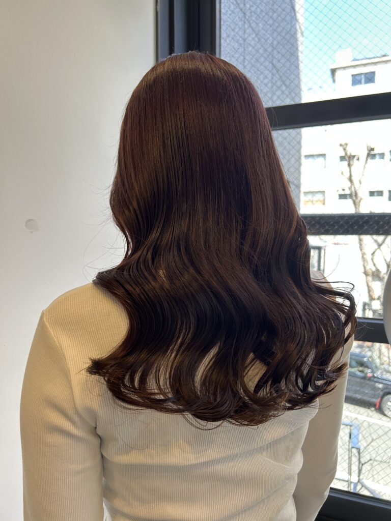 2. 初カラーだからこその「色持ち重視」配合 初めてカラーをする髪(バージン毛)は、色が綺麗に入りやすい反面、実は色が抜けやすいという特徴もあります。 せっかくの初カラーを長く楽しんでいただくために、あえて少し深めに色を入れました。 深めに入れることで色持ちが良くなり、色が落ちていく過程も「柔らかいピンクブラウン」として長く楽しむことができます。
