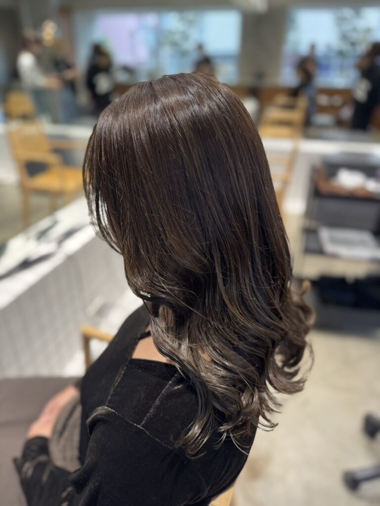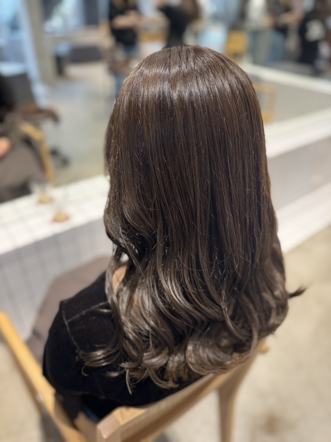 今回のメニューは**【カット+カラー】**です。 当日の着物とのバランスや、ヘアアレンジのしやすさを最優先に考えて施術を行いました。