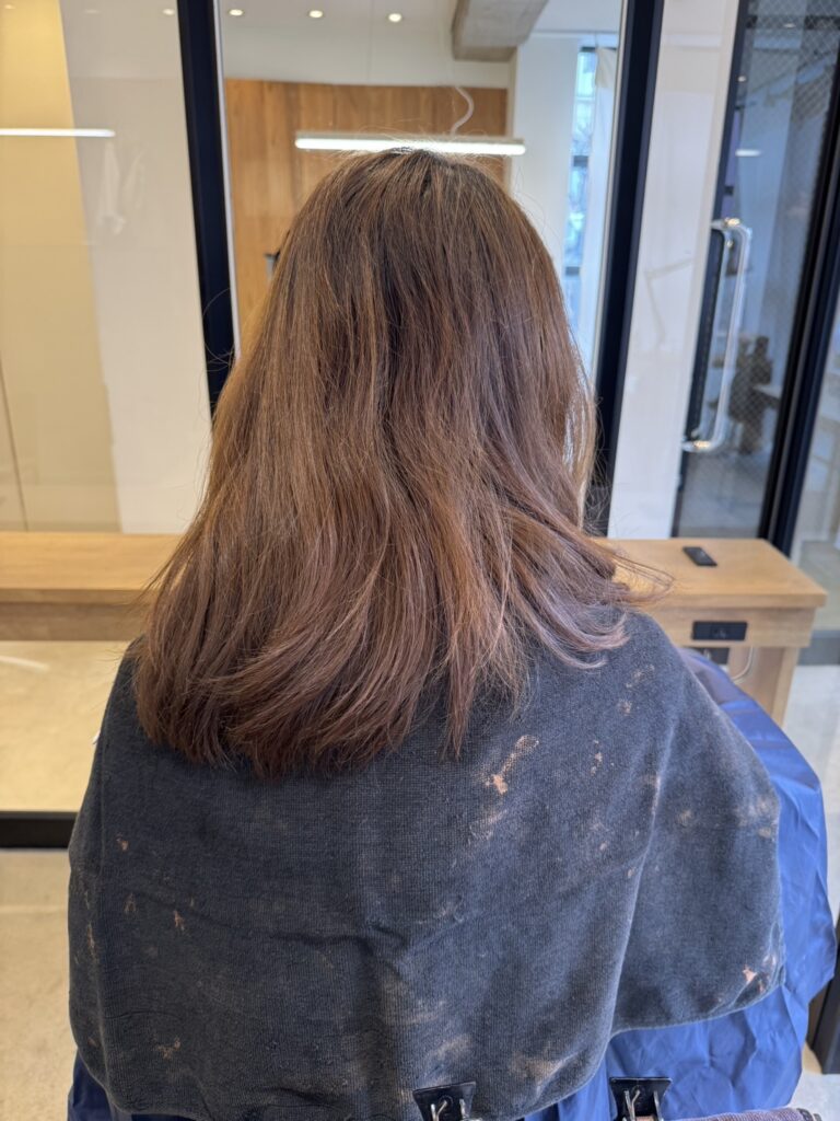 今回のメニューは**【カット+カラー+トリートメント】**です。 お客様の「今後やってみたい色」まで計算に入れたカラー選定を行いました。