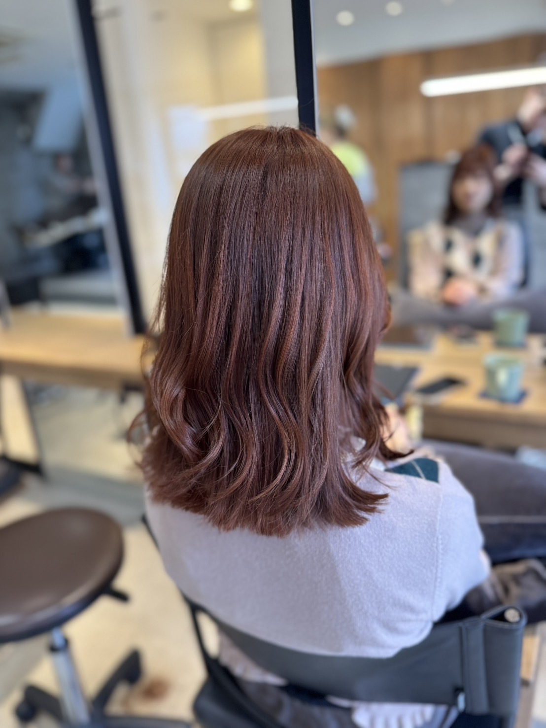 1. 「オレンジ→赤」の順番で楽しむカラー計画 お客様はオレンジか赤系のカラーで迷われていました。 ここで赤を先に入れてしまうと、次にオレンジにしたい時に赤みが残りすぎて難しくなります。 そこで今回は、**「まずはオレンジを楽しんで、次に赤にする」**という順番をご提案。これなら両方の色味を綺麗に楽しめます! ベースの明るさは変えず、黄みを打ち消すジューシーなオレンジを入れました。